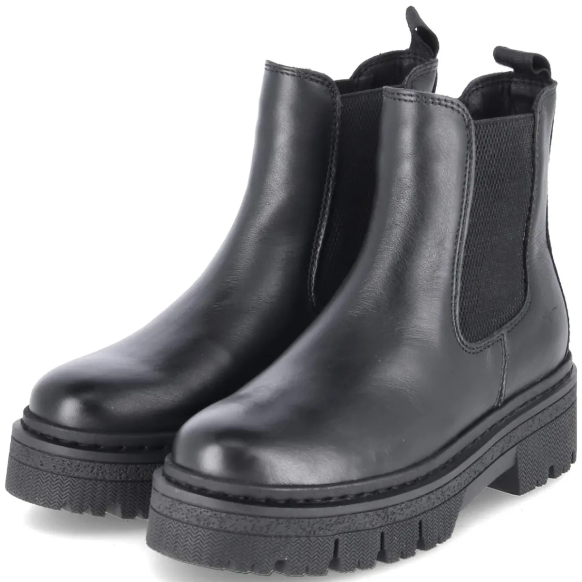 Zeitloser Look trifft Komfort: Die Chelsea Boots von Tamaris zeigen sich in schwarzem Glattleder aus langlebigem Echtleder und setzen mit moderner Optik ein souveränes Statement. Der 5 cm hohe Blockabsatz harmoniert mit einer rutschfesten Profilsohle, deren vorderes Plateau von etwa 3 cm den Auftritt abfedert und die Silhouette dezent streckt. Seitliche Elastikeinsätze und eine Anziehlasche erleichtern das Hineinschlüpfen, während der verstärkte Fersenbereich Stabilität verleiht. Ein gut gepolstertes, herausnehmbares Fußbett und eine weiche Textildecksohle sorgen zusammen mit leichtem Futter für angenehmen Tragekomfort an kühlen Tagen. Der runde Leisten und die größengetreue Passform machen das Modell alltagstauglich und cityfein zugleich. Modetipp: Zu schmalen Cropped-Jeans und einem Wollmantel entsteht ein cleaner Look, der sich mit einer Leder-Bag und dezentem Schmuck elegant abrunden lässt.