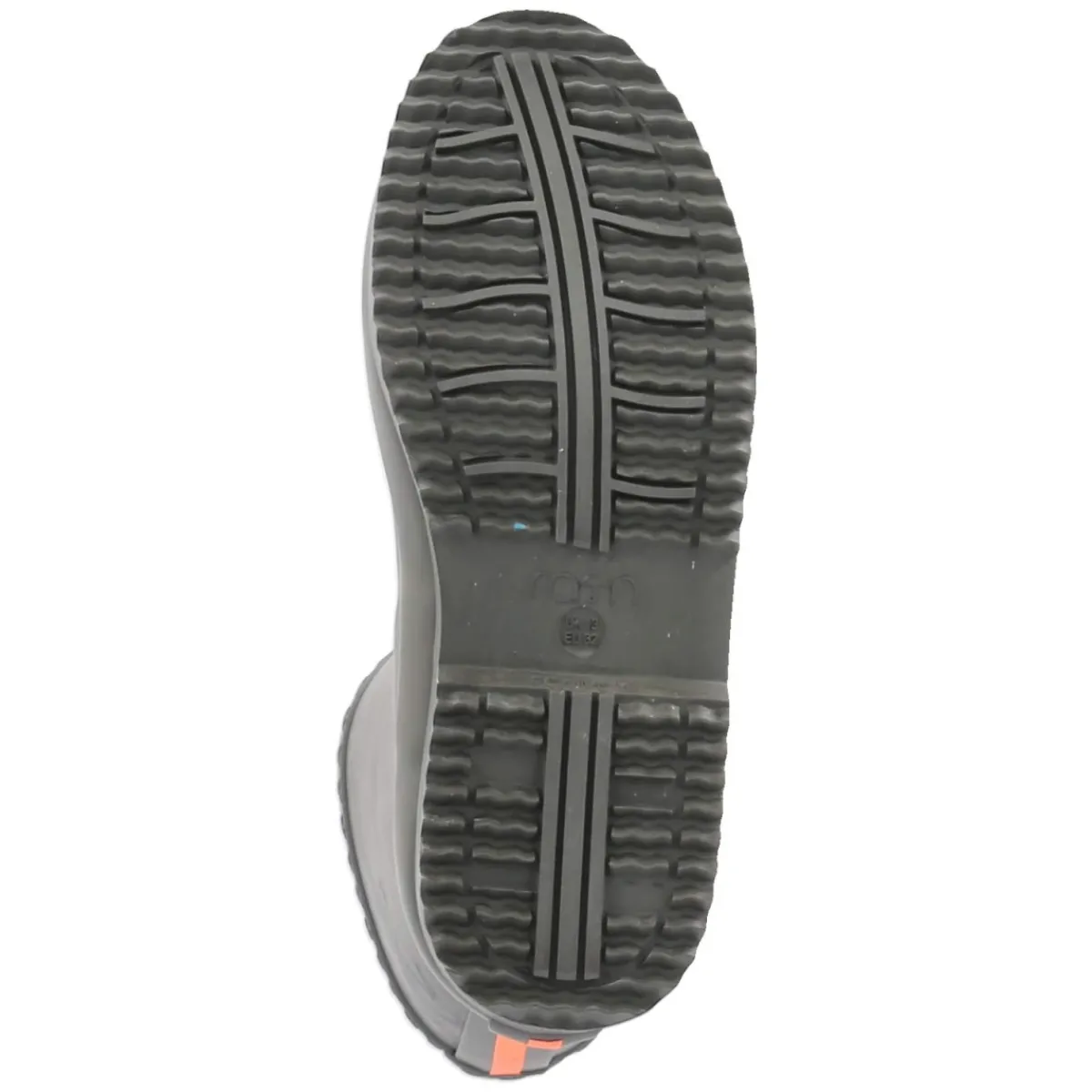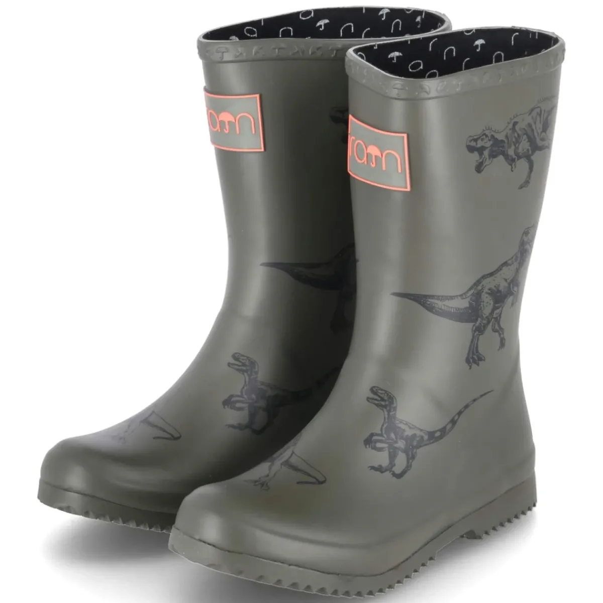 Mit dem grünen Gummistiefel von Rajn wird jedes Regenabenteuer zum Vergnügen. Das wasserfeste Obermaterial aus Gummi schützt zuverlässig, während das bedruckte Design mit verschiedenen Dinos in dezentem Schwarz spielerische Akzente setzt. Die runde Spitze und der Verzicht auf einen Verschluss sorgen für unkomplizierten Einstieg, der verstärkte hintere Schaft mit orangefarbenen Streifen gibt zusätzliche Stabilität. Innen bietet ein dünnes Textilfutter ein angenehmes Klima, das gepolsterte Wechselfußbett mit Textildecksohle erhöht den Komfort und lässt sich für individuelles Tragen herausnehmen. Die flexible, rutschfeste Profilsohle gewährleistet sicheren Halt auf nassem Untergrund. Der Schuh fällt normal aus und zeigt vielfältige Kombinationsmöglichkeiten. Modetipp: Besonders harmonisch zu gelber Regenjacke und dunkelblauer Jeans, dazu eine passende Mütze in Orange als Farbakzent.