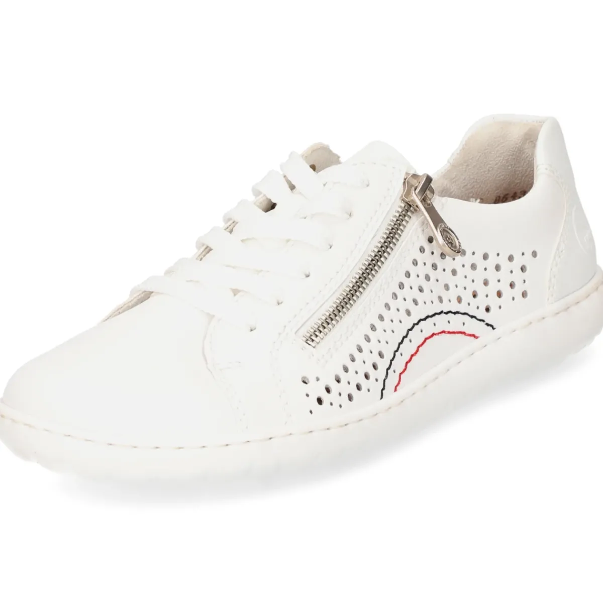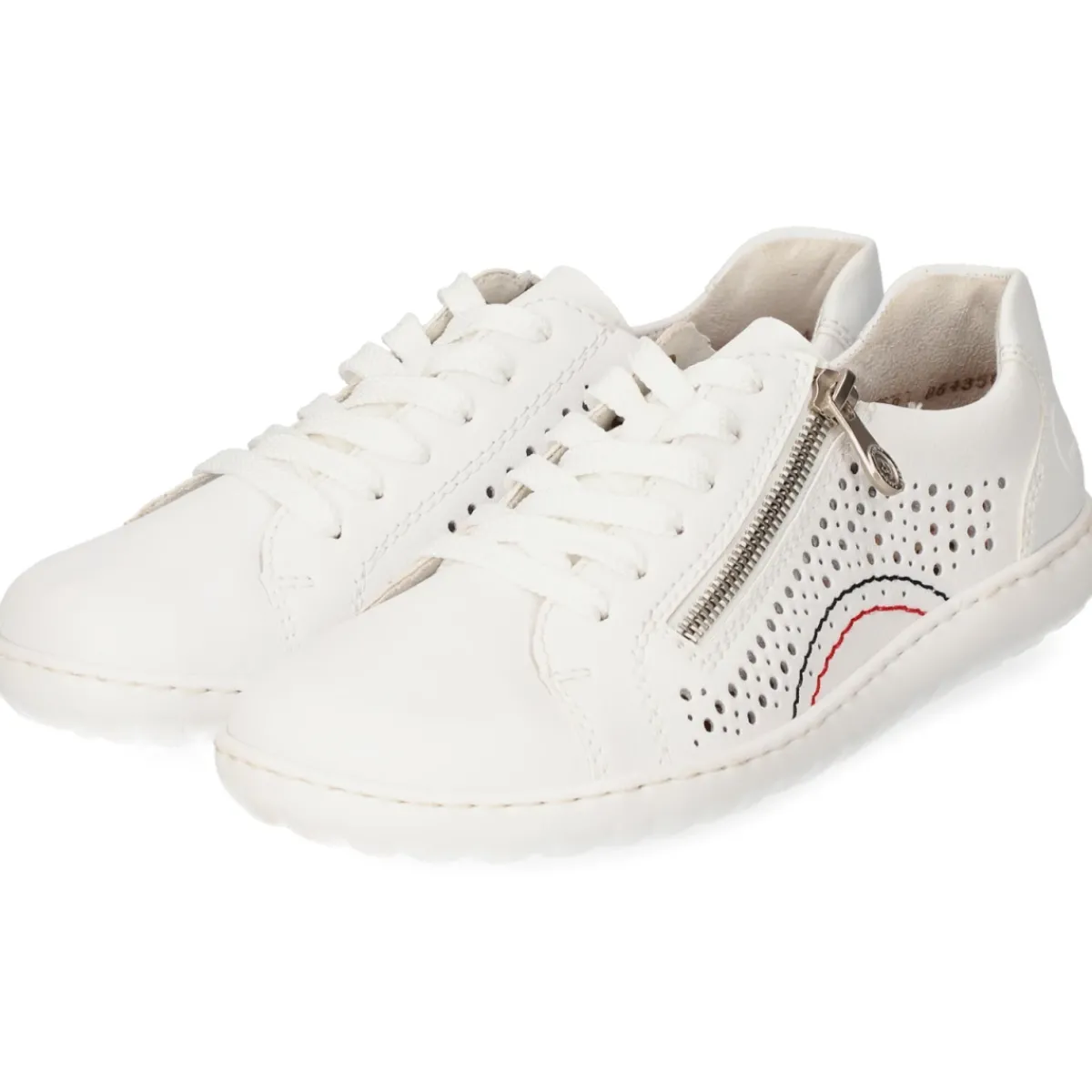 Zeitloser Damen-Halbschuh von Rieker in Weiß mit moderner Optik und vielseitigen Kombinationsmöglichkeiten. Das Obermaterial aus langlebigem Echtleder zeigt ein seitliches Lochstanzmuster, das für luftiges Tragegefühl sorgt und den Look subtil akzentuiert. Die runde Schuhspitze unterstreicht den komfortablen Schnitt, während die Kombination aus Schnürung und seitlichem Reißverschluss ein schnelles An- und Ausziehen ermöglicht. Ein gepolsterter Einstieg und die weich gepolsterte Decksohle aus Synthetik bieten spürbare Bequemlichkeit im Alltag. Die flexible, griffige Laufsohle unterstützt einen natürlichen Abrollvorgang und gibt zuverlässigen Halt. Mit Logo-Detail im Fersenbereich und passgenauer Form fällt das Modell normal aus und ergänzt mühelos Casual- wie Smart-Casual-Looks. Modetipp: Zu Cropped-Jeans, weißem T-Shirt und einer leichten Strickjacke in Beige entsteht ein cleanes Monochrom-Outfit mit frischem Akzent.