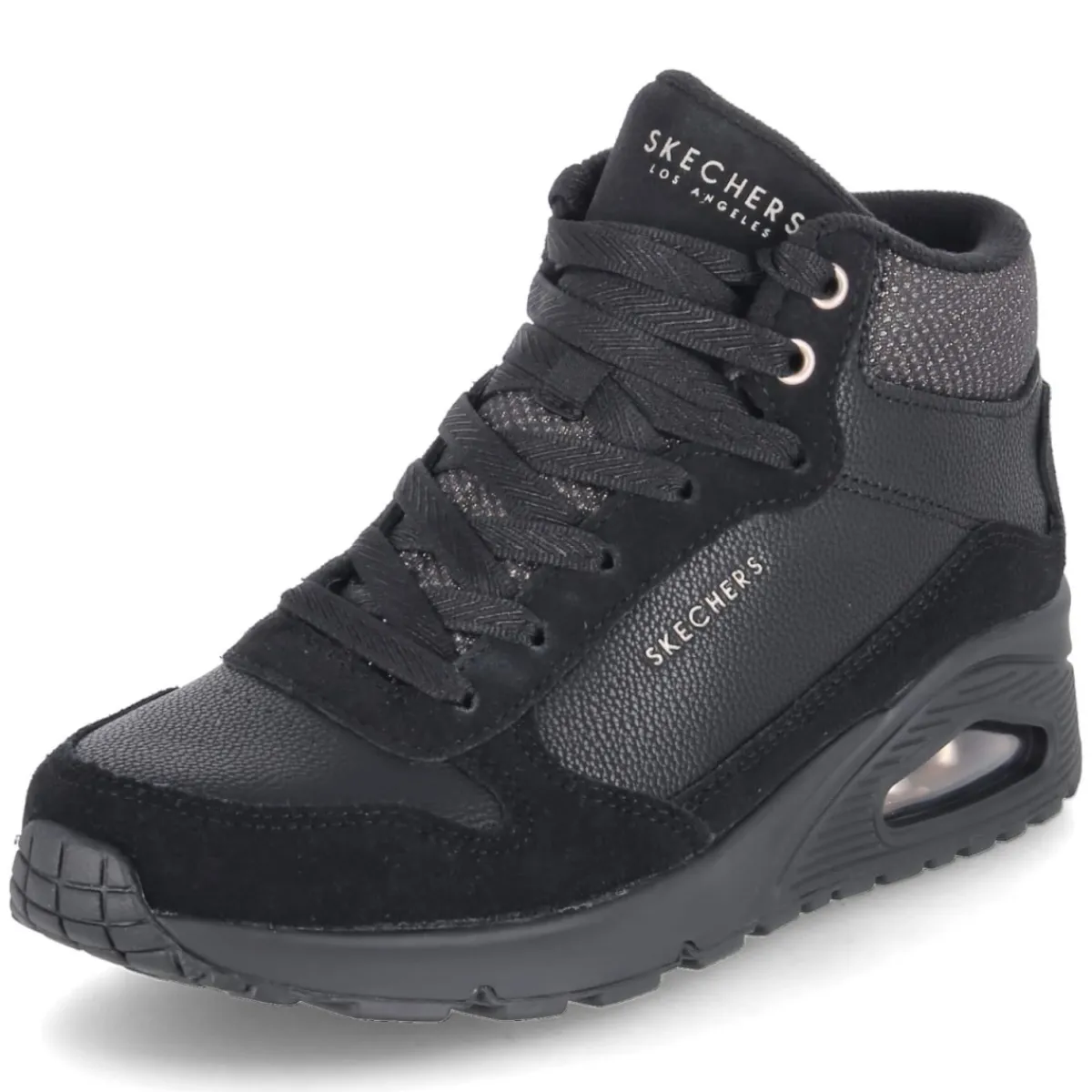 Der High Sneaker UNO-STARCE SHINE von Skechers verbindet urbanen Chic mit durchdachtem Komfort. Der moderne Material-Mix aus Leder und Synthetik trifft auf golden schimmernde Highlights, die auf dem tiefschwarzen Upper edel zur Geltung kommen. Die hohe Silhouette mit runder Spitze umschließt den Fuß sicher, während das beste Memory-Foam-Fußbett und die textile Decksohle soft abfedern. Die flexible, rutschfeste Laufsohle mit Sichtfenster in der Ferse unterstützt ein angenehmes Abrollen, der Zehen- und Fersenbereich ist robust verstärkt. Eine klassische Schnürung wird durch praktische Klettdetails sinnvoll ergänzt und erleichtert das An- und Ausziehen. Leichtes Futter macht den Sneaker zur smarten Wahl für kühle Tage. Fällt normal aus. Modetipp: Mit Cropped-Jeans, Oversize-Blazer und feinen Stricksocken entsteht ein moderner City-Look, der die goldenen Akzente stilvoll aufgreift.