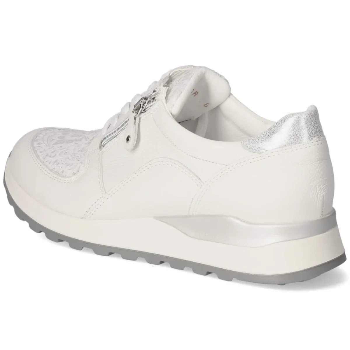 Der Low Sneaker HIROKO von Waldläufer verbindet sportive Linie und fein gearbeitete Details. Weißes Leder und Textil bilden einen robusten Material-Mix, den ein silberfarbenes Blumenmuster und glänzende Akzente modern akzentuieren. Die runde Spitze sorgt für Zehenfreiheit, der gepolsterte Einstieg und die textile Decksohle umschmeicheln den Fuß. Für Komfort im Alltag steht das komfortable Wechselfußbett, das bei Bedarf gegen eigene Einlagen getauscht werden kann. Schnürsenkel schaffen präzisen Halt, der zusätzliche Reißverschluss erleichtert den Einstieg. Eine flexible Laufsohle federt jeden Schritt ab, verstärkte Zehen- und Fersenbereiche geben Stabilität, Ziernähte runden das Design ab. Der Schnitt fällt normal aus und ist auf Damenfüße abgestimmt. Modetipp: Zu Cropped-Chino und Oversize-Blazer entsteht ein cleaner City-Look, den eine silberne Crossbody-Bag stimmig aufgreift.