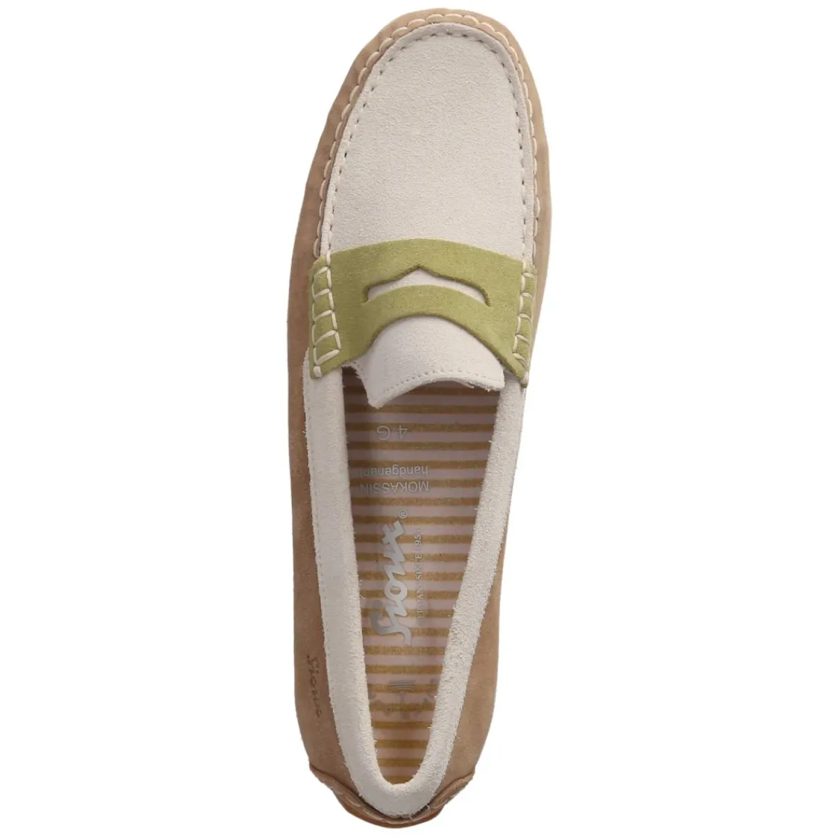 Mokassin CARMONA von Sioux in sanftem Beige verbindet zeitlose Eleganz mit lässigem Komfort. Das Obermaterial aus weichem Rauleder zeigt eine samtige Oberfläche, die mit modischer Wulstnaht und grünfarbigem Zierriemen den charakteristischen Look betont. Atmungsaktives Echtleder und ein angenehmes Leder-Textilfutter sorgen für ein wohltuendes Klima, während die runde Schuhspitze und die flexible, rutschhemmende Laufsohle entspanntes Gehen fördern. Der Einstieg gelingt ohne Verschluss, das gepolsterte Wechselfußbett mit synthetischer Decksohle steigert die Bequemlichkeit und lässt sich bei Bedarf austauschen. Die Passform fällt normal aus und unterstützt einen unkomplizierten Auftritt im Alltag. Modetipp: Besonders harmonisch zu cremefarbenen Chinos, feinem Strick und einem olivgrünen Accessoire, das den Zierriemen aufgreift.