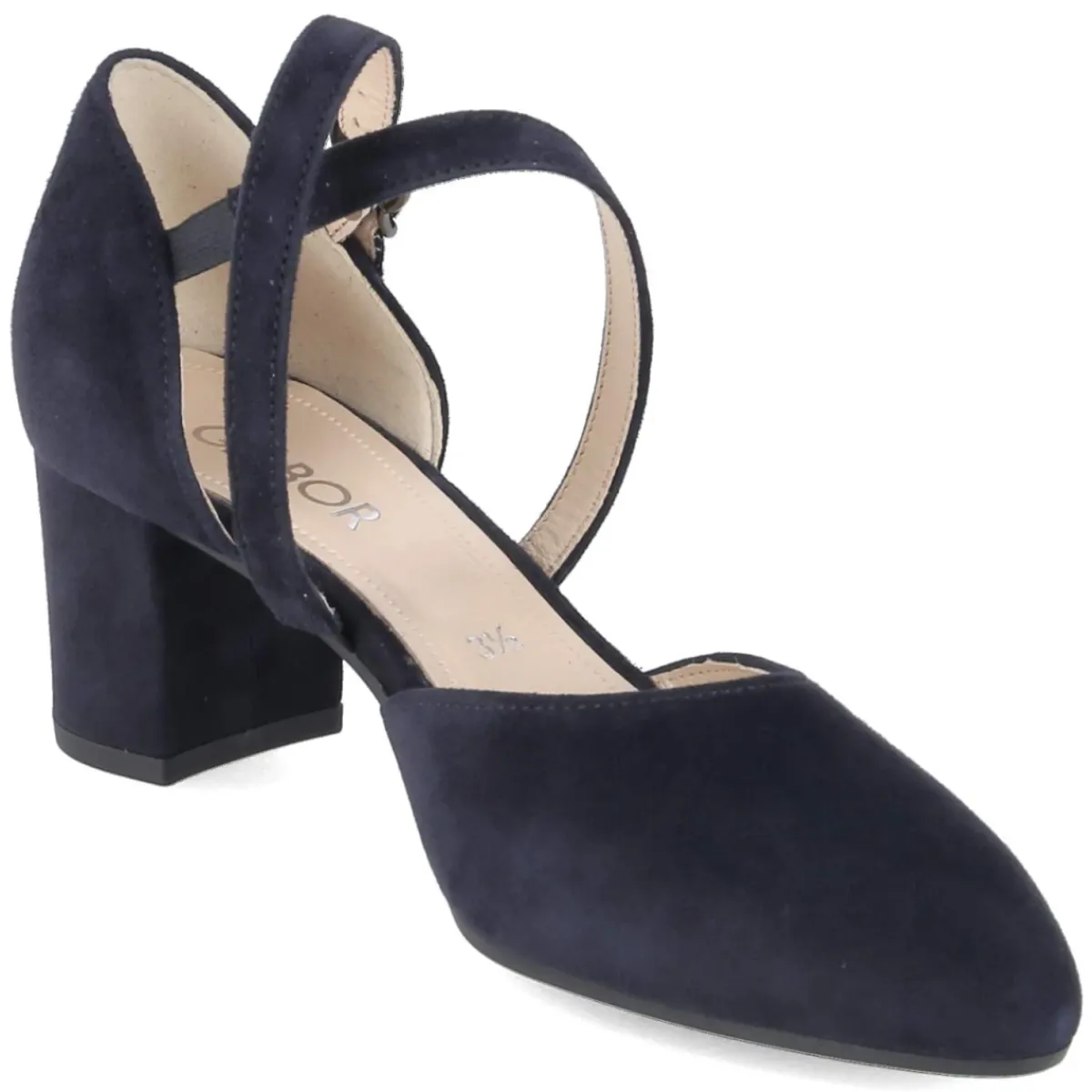 Gabor Pumps in Dunkelblau vereinen Eleganz und Komfort. Das Obermaterial aus feinem Rauleder zeigt eine samtige Oberfläche, die den spitzen Leisten edel unterstreicht. Gekreuzte Riemchen mit Elastikeinsatz schmiegen sich über den Spann und schließen über eine Schnalle mit Druckknopf, wodurch der Einstieg bequem und der Halt zuverlässig bleibt. Für langes Tragen sorgt ein weich gepolstertes Fußbett in Kombination mit einer atmungsaktiven Decksohle aus Leder. Die flexible, rutschfeste Laufsohle unterstützt jeden Schritt, während der 6 cm hohe Blockabsatz die Silhouette streckt und dennoch stabil wirkt. Der Größenhinweis fällt normal aus, was die Wahl erleichtert. Modetipp: Zu einem fließenden Midikleid oder einer Marlenehose in Navy harmonieren die Pumps besonders gut; ein heller Trenchcoat setzt dazu einen feinen Kontrast.