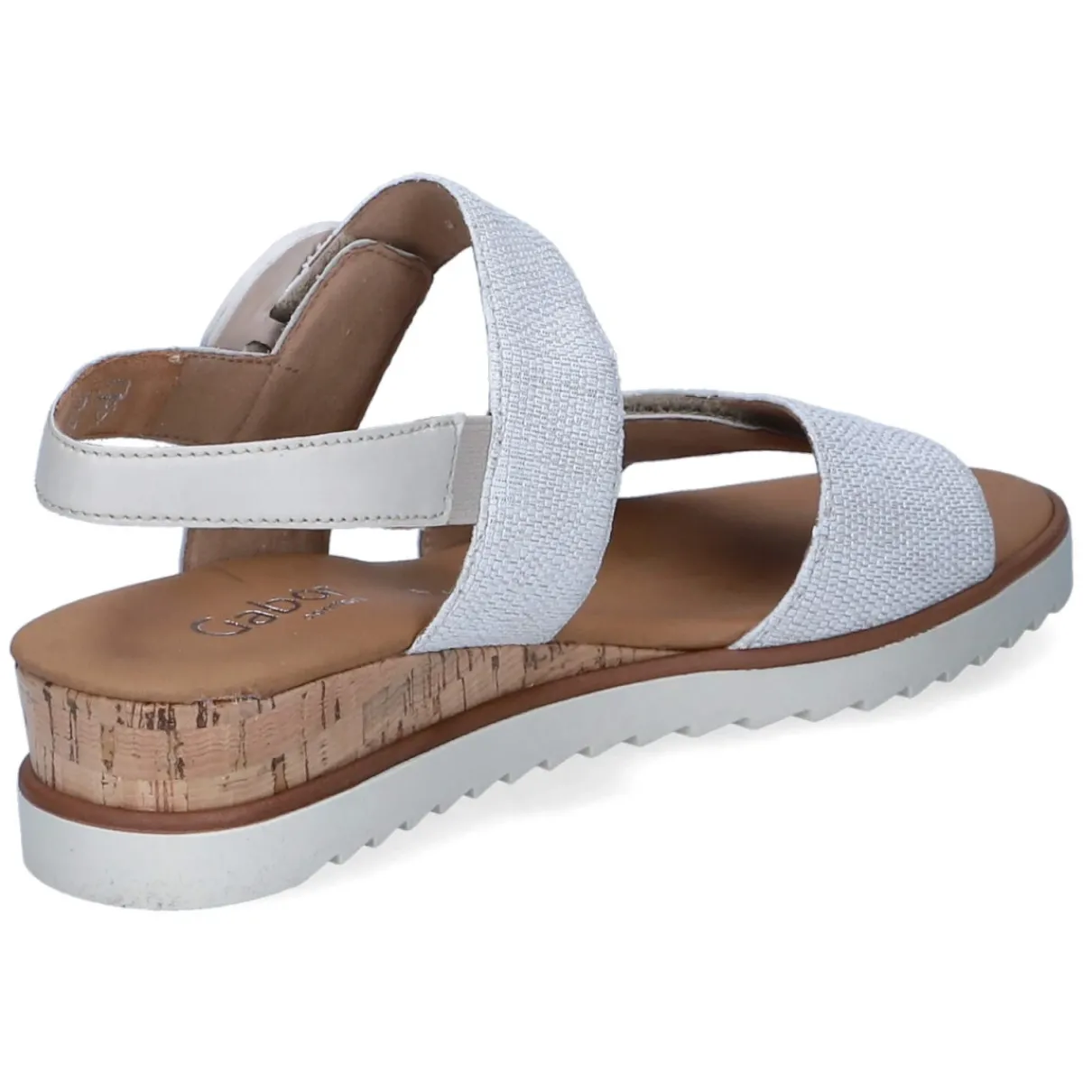 Elegante Damen-Sandaletten von Gabor in strahlendem Weiß setzen sommerliche Akzente und schenken dank 4 cm hohem Keilabsatz eine sanfte Erhöhung. Das Obermaterial aus hochwertigem Glattleder und die lederne, weich gepolsterte Decksohle sorgen für angenehmes Fußklima und langanhaltenden Komfort. Zwei praktische Klettverschlüsse erlauben eine individuelle Weitenregulierung, der Fersenriemen mit Elastikeinsatz gibt sicheren Halt, während die stabile Laufsohle auf verschiedenem Untergrund überzeugt. Die offene Schuhspitze und der Sohlenkeil in natürlicher Korkoptik unterstreichen den leichten Look. Das Modell fällt größengetreu aus und eignet sich ideal für Alltag und Urlaub. Modetipp: Zu hellen Leinenhosen, Pastelltönen oder einem monochromen White-Look entsteht ein frisches Ensemble; Accessoires in Bast oder Silber setzen stilvolle Akzente.