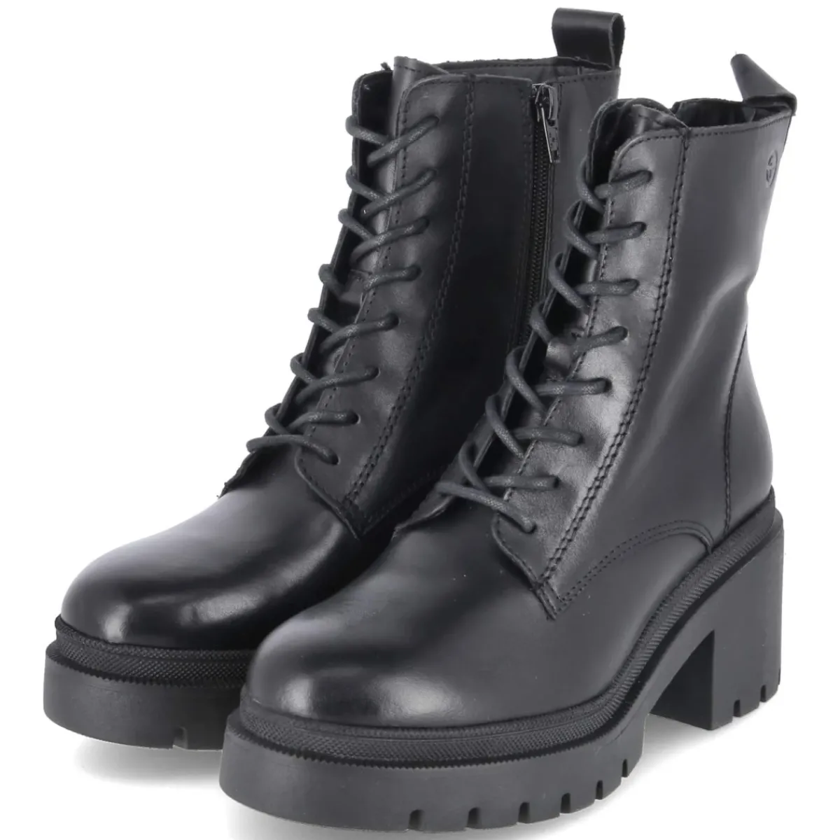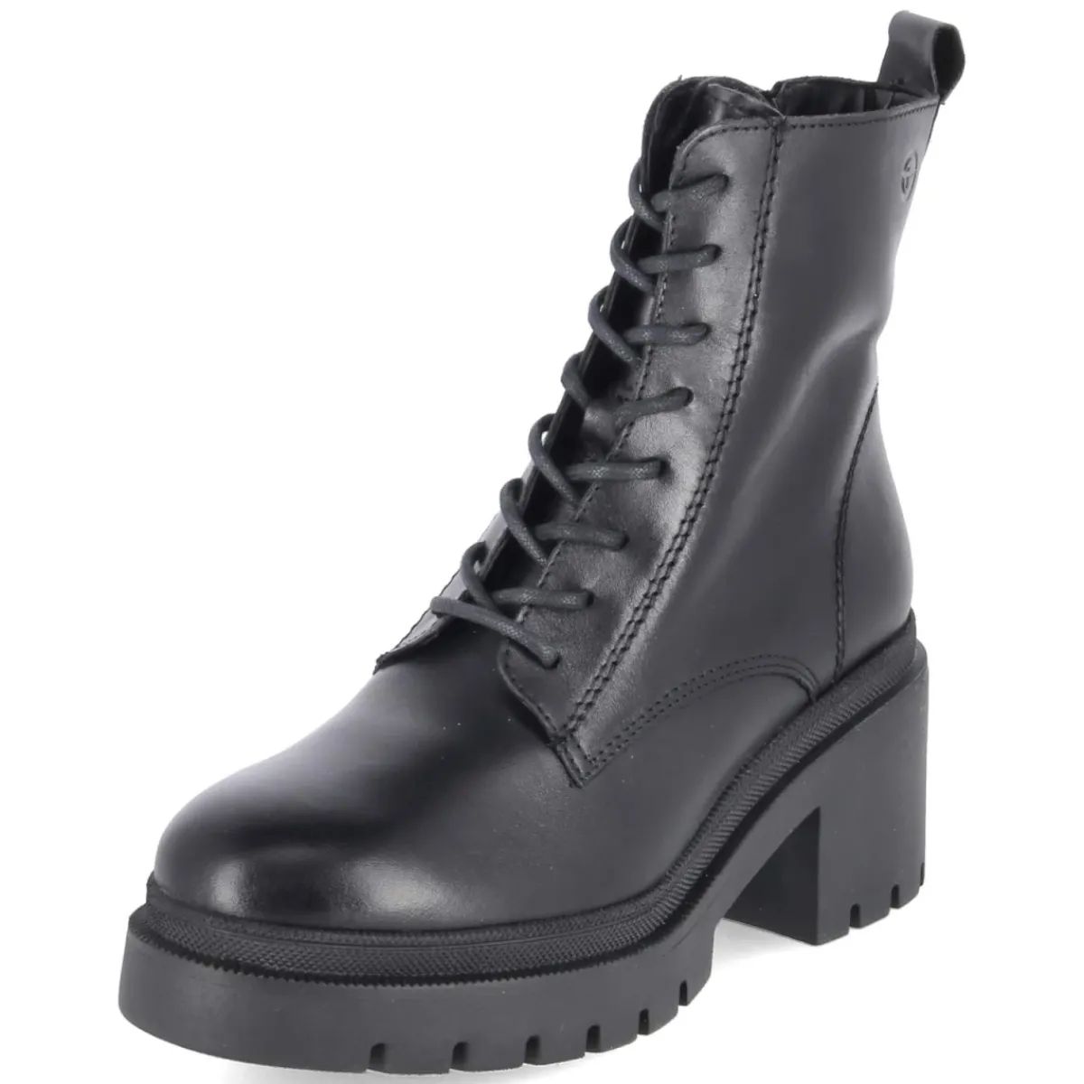 Der Tamaris Schnürboot in klassischem Schwarz verbindet urbane Eleganz mit verlässlichem Komfort. Das Obermaterial aus langlebigem Echtleder zeigt eine glatte, edle Oberfläche und wird durch eine verstärkte Ferse und eine praktische Anziehlasche ergänzt. Für bequemes An- und Ausziehen sorgt die Kombination aus Schnürung und seitlichem Reißverschluss, während ein gepolstertes Fußbett und die rutschfeste Profilsohle angenehmen Halt im Alltag bieten. Der 7,5 cm hohe Blockabsatz steht stabil, das kleine Plateau von ca. 3 cm entlastet den Fuß zusätzlich. Mit runder Schuhspitze, normaler Passform und einer Decksohle aus Textil & Synthetik überzeugt der Damen-Boot als vielseitiger Begleiter von früh bis spät. Modetipp: Zu Midirock und Strickpullover entsteht ein moderner City-Look, akzentuiert durch einen strukturierten Wollmantel.