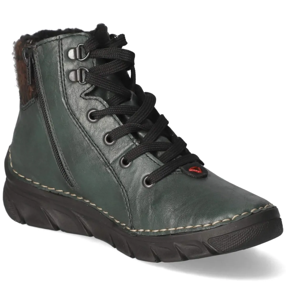 Dieser Rieker Schnürboot in frischem Grün verbindet Komfort und Stil auf zeitgemäße Weise. Das Obermaterial aus modern designter Synthetik erhält durch den Schaftrand in Strickoptik und die weiße, rustikale Ziernaht am Sohlenrand eine ausdrucksstarke Note. Warmfutter und gepolstertes Fußbett sorgen für behagliche Wärme und ein weiches Auftreten, die textile Decksohle unterstützt atmungsaktiven Tragekomfort. Dank Schnürsenkeln und zusätzlichem Reißverschluss gelingt der Einstieg mühelos, während die rund geformte Spitze und die verstärkte Ferse den Fuß angenehm führen. Markendetails runden das Gesamtbild ab, die flexible, rutschfeste Laufsohle bietet verlässlichen Halt auf wechselnden Untergründen. Der Größenhinweis fällt normal aus und macht die Wahl unkompliziert. Modetipp: Mit Strickkleid, blickdichter Strumpfhose und Wollmantel entsteht ein urban-femininer Look mit spannender Materialmischung.