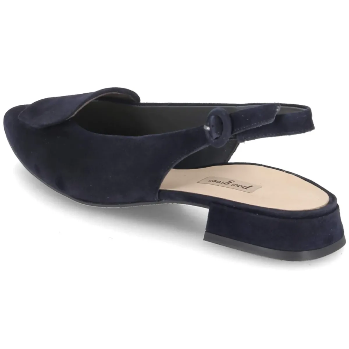 Die Slingballerinas von Paul Green setzen auf eine moderne, feminine Linie in edlem Dunkelblau. Feines Rauleder mit samtiger Oberfläche betont die spitz zulaufende Form, während ein aufgesetztes Element im Zehenbereich einen stilvollen Akzent liefert. Der 3 cm hohe Blockabsatz verleiht dezente Höhe und souveränen Halt. Für Komfort sorgen die leicht gepolsterte, hautfreundliche Lederdecksohle und die flexible, rutschhemmende Laufsohle. Der Fersenriemen mit Schnalle und Elastikeinsatz bietet passgenauen Sitz, das Modell fällt normal aus. So entsteht ein vielseitiger Begleiter für Büro und Anlass, der Eleganz und Alltagstauglichkeit mühelos verbindet. Modetipp: Zu schmaler Zigarettenhose und fließender Seidenbluse kombinieren, dazu ein strukturierter Blazer in Marine für einen klaren, urbanen Look.