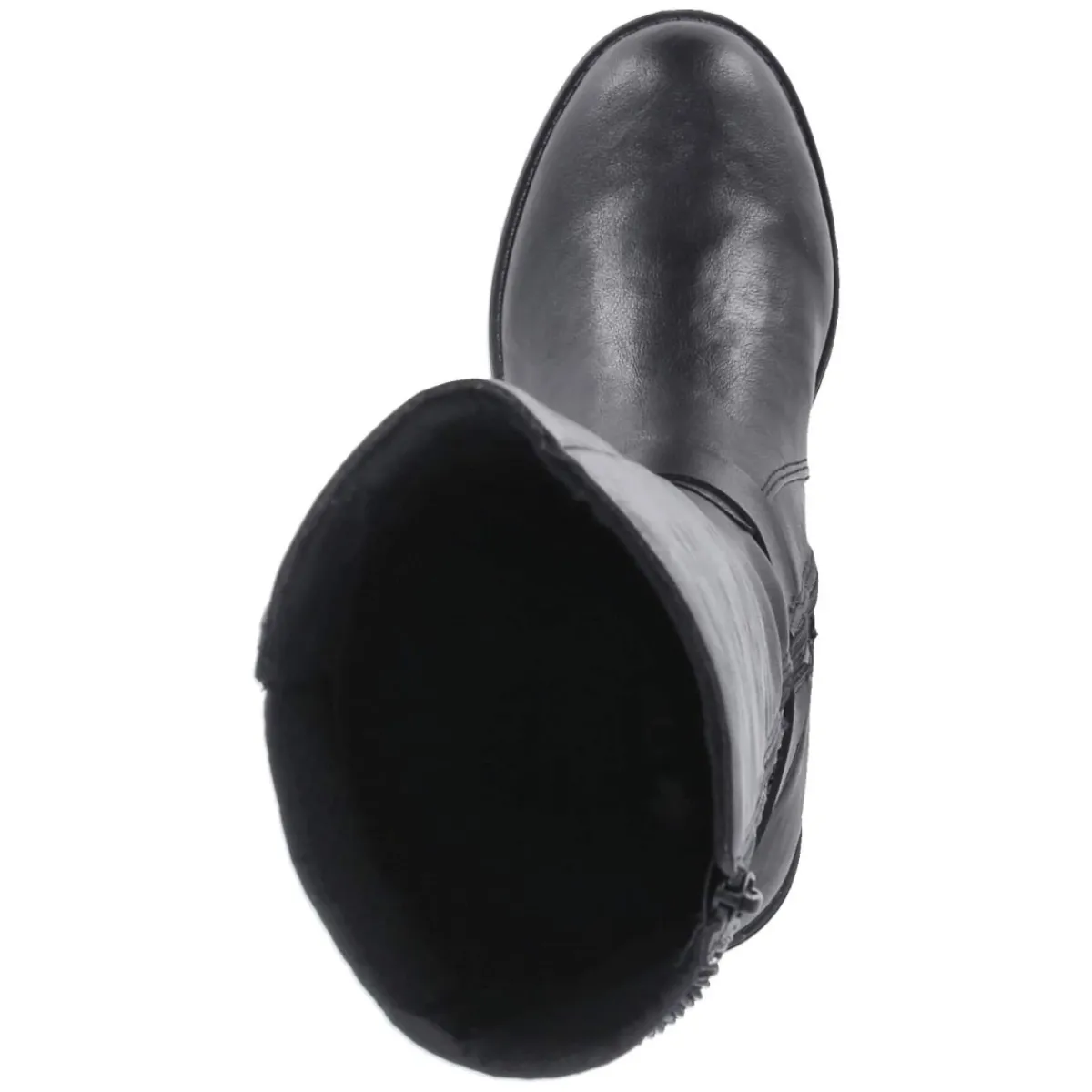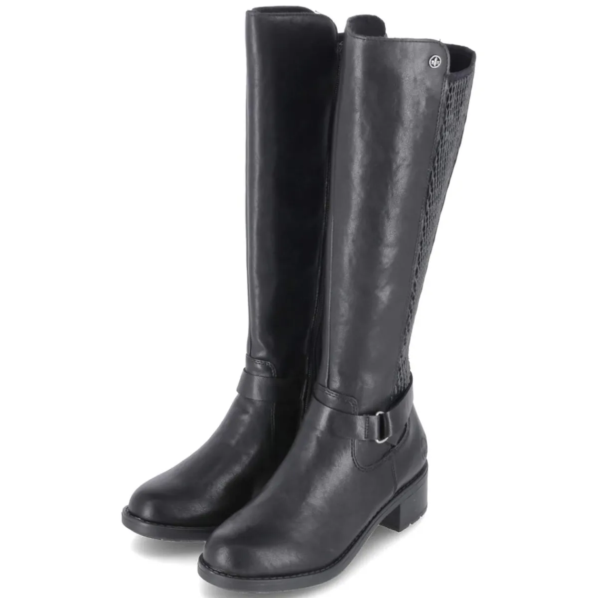 Dieser schwarze Damenstiefel von Rieker verbindet alltagstauglichen Komfort mit eleganter Zurückhaltung. Das pflegeleichte Obermaterial aus Synthetik zeigt sich in zeitloser Optik, während die runde Schuhspitze und der 4,5 cm hohe Blockabsatz für ein harmonisches Silhouette-Update sorgen. Ein bequemer Reißverschlusseinstieg erleichtert das An- und Ausziehen, der Varioschaft mit stretchigem, hinten geflochten wirkendem Einsatz passt sich unterschiedlichen Waden an. Das Schaftmaß liegt bei ca. 35 cm Höhe und 36 cm Umfang. Im Inneren sorgt ein leichtes Fleecefutter für behagliche Wärme, die textile Decksohle und das komfortable Wechselfußbett bieten angenehme Dämpfung. Eine flexible, rutschfeste Laufsohle gibt sicheren Halt, der zierende Knöchelriemen setzt einen dezenten Akzent. Modetipp: Mit Midikleid in Rippstrick und Oversize-Wollmantel entsteht ein lässig-femininer City-Look.