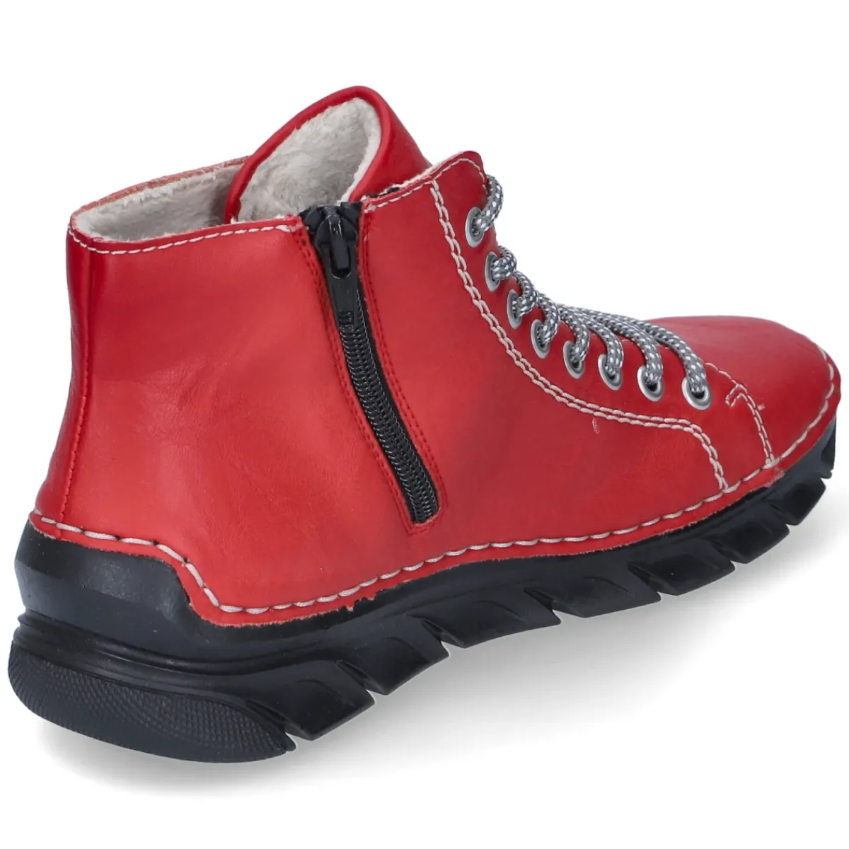 Die Damen-Stiefeletten von Rieker setzen mit ihrem satt roten Obermaterial aus pflegeleichtem Kunstleder ein markantes Statement und verwöhnen zugleich mit spürbarem Komfort. Warmfutter und textile Decksohle umschließen den Fuß weich und halten angenehm temperiert, während die runde Schuhspitze natürliche Bewegungsfreiheit lässt. Die praktische Kombination aus Schnürsenkeln und seitlichem Reißverschluss sorgt für einen bequemen Einstieg und ermöglicht dennoch eine individuelle Anpassung am Spann. Ein herausnehmbares Wechselfußbett eröffnet zusätzlichen Platz für eigene Einlagen und unterstützt ein hygienisches Tragegefühl im Alltag. Dank ihrer ausgewogenen Formgebung passen die Stiefeletten zu vielseitigen City- und Freizeit-Looks und überzeugen mit langlebiger Pflegeleichtigkeit. Modetipp: Zu einem Strickkleid und blickdichten Strumpfhosen getragen entsteht ein femininer Winterlook, den ein klassischer Mantel in Karamell oder Camel stilvoll abrundet.