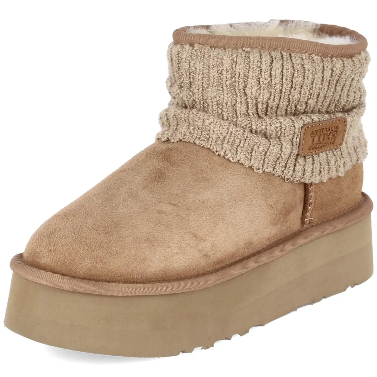 Winterboots FAME von Australia Luxe setzen in Braun auf kuschlige Wärme und moderne Linie. Der robuste Material-Mix aus Leder und Textil trifft auf ein weiches Lammfellfutter, das gemeinsam mit der Textildecksohle für spürbaren Wohlfühlfaktor sorgt. Die starke, leichte Plateausohle mit 4,5 cm Höhe gibt neuen Stand, während runde Spitze und das Design ohne Verschluss unkomplizierte Eleganz liefern. Markante Nähte, die verstärkte Ferse mit Metall-Label sowie der gepolsterte Einstieg mit Umschlagkrempe und Lederpatch in Strickoptik runden den Look ab. Das Modell fällt normal aus und begleitet mühelos durch kalte Tage. Modetipp: Besonders stimmig zu wadenlangen Strickkleidern und Oversize-Mänteln, dazu gerippte Socken, die dezent über den Schaft blitzen.