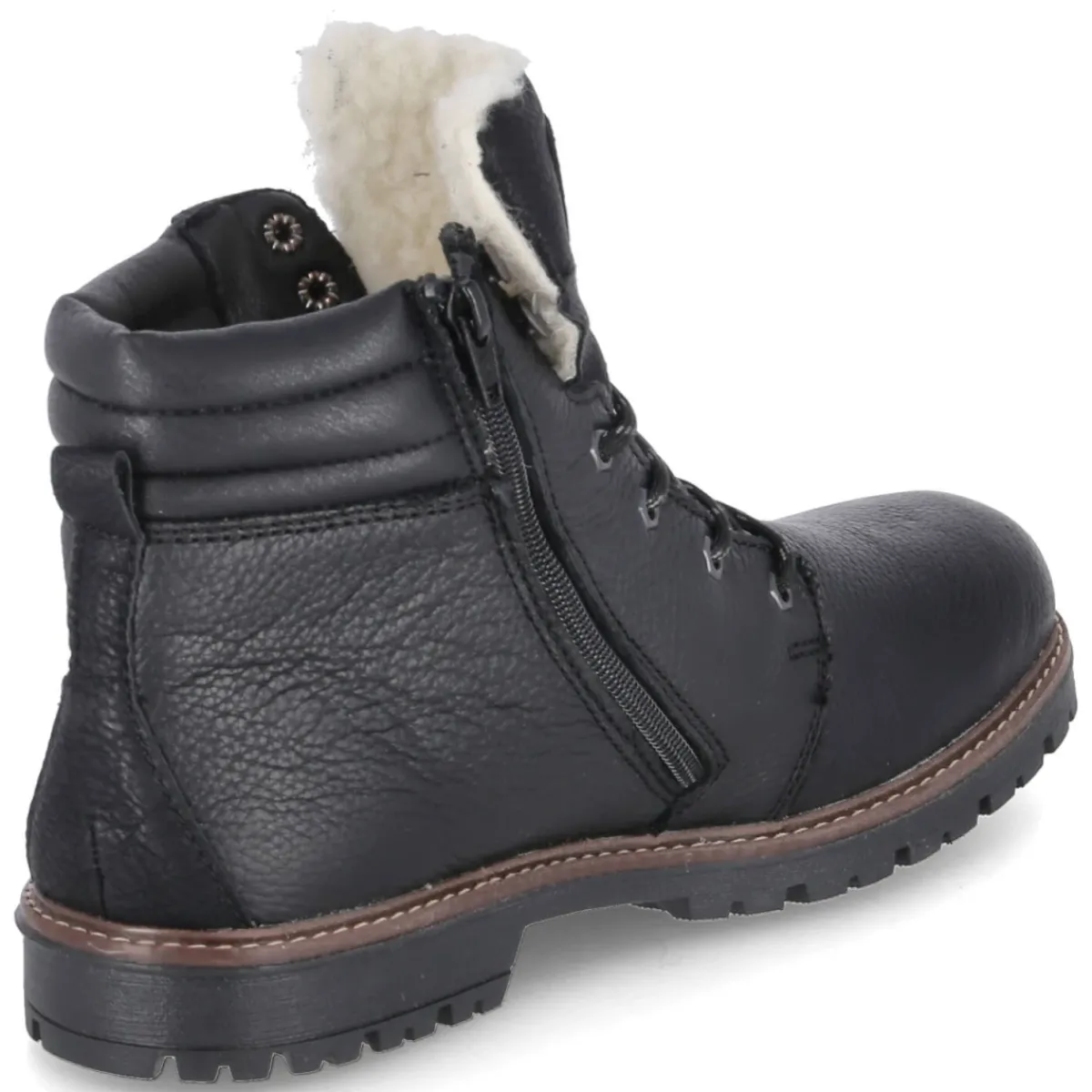 Rieker Winterboots für Herren verbinden in klassischem Schwarz funktionale Stärke mit hohem Tragekomfort. Das Obermaterial aus Leder und Synthetik schützt zuverlässig, die Kombination aus wasserfester Ausrüstung und wasserabweisender Oberfläche hält Straßenmatsch souverän fern. Warmfutter speichert wohltuende Wärme, während die atmungsaktive Beschaffenheit ausgeglichenes Fußklima unterstützt. Die runde Spitze bietet Bewegungsfreiheit, die textile Decksohle fühlt sich angenehm an. Schnürsenkel erlauben präzise Anpassung, der seitliche Reißverschluss sorgt für einen bequemen Einstieg. Ein 3 cm hoher Blockabsatz garantiert stabilen Stand und angenehme Dämpfung. Der Schuh fällt normal aus und passt komfortabel in der gewohnten Größe. Modetipp: Mit Wollmantel, grobem Strickpullover und dunkler Denim entsteht ein zeitloser City-Look, der praktische Funktion und Stil vereint. GÖTZ-Artikelnummer: 162001200182.