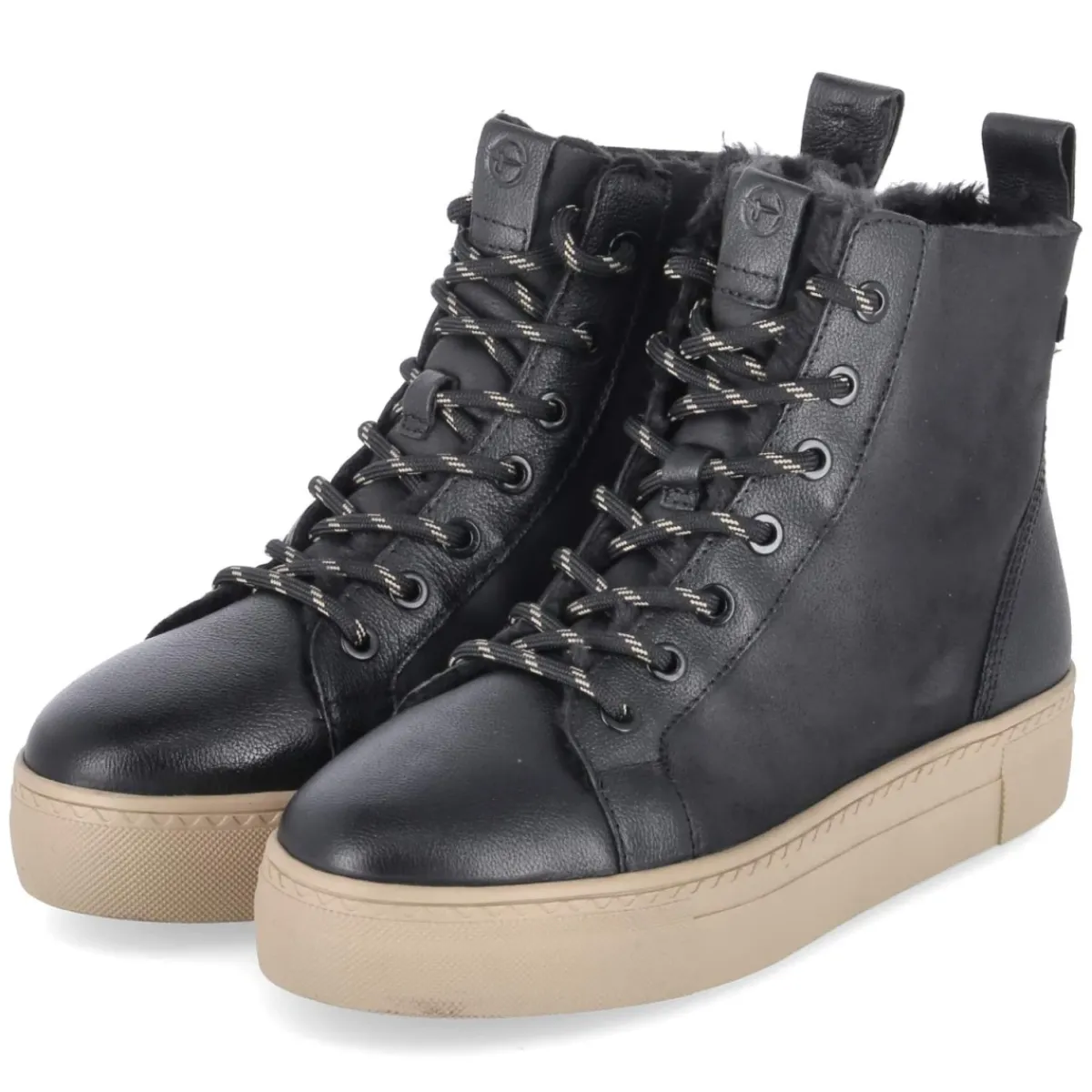 Der Wintersneaker von Tamaris in klassischem Schwarz vereint Komfort und urbanen Stil. Das Obermaterial aus Leder und Textil bildet einen robusten Material-Mix, während Warmfutter und ein gepolstertes Fußbett angenehme Wärme und Dämpfung schenken. Die rutschfeste Plateausohle mit etwa 3 cm Höhe sorgt für stabilen Halt, die runde Schuhspitze bietet Zehenfreiheit. Praktisch präsentieren sich Schnürsenkel und zusätzlicher Reißverschluss: variabler Sitz und schneller Einstieg in einem. Eine verstärkte Ferse unterstützt den sicheren Tritt, die textile Decksohle ergänzt den weichen Tragekomfort. Dank normaler Passform fällt die Größe verlässlich aus. Modetipp: Zum Wollmantel und schmaler Denim sowie groben Stricksocken kombinieren – so entsteht ein lässiger City-Look mit winterfester Note.