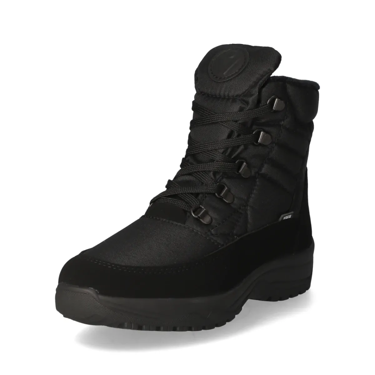 Die Winterstiefeletten von Vista in klassischem Schwarz kombinieren wetterfesten Schutz mit hohem Komfort. Das robuste Obermaterial aus Textil und die wasserabweisende, atmungsaktive Ausstattung sichern ein angenehmes Fußklima, während das weiche Warmfutter zuverlässig wärmt. Schnürung und Reißverschlusseinstieg sorgen zusammen für passgenauen Halt und schnellen Einstieg. Die runde Schuhspitze schenkt Zehenfreiheit, der gepolsterte Schaft entlastet den Knöchel. Für maximale Trittsicherheit auf Eis und Schnee steht die flexible OC-System-Profilsohle mit ausklappbaren Spikes bereit; rutschhemmend bei Glätte und komfortabel im Alltag. Die gepolsterte, herausnehmbare Wechseldecksohle bietet weiche Dämpfung und lässt sich bei Bedarf gegen eigene Einlagen tauschen. Modetipp: Zu einer verkürzten Wollhose und einer voluminösen Steppjacke entsteht ein cleaner, sportiver Winterlook.