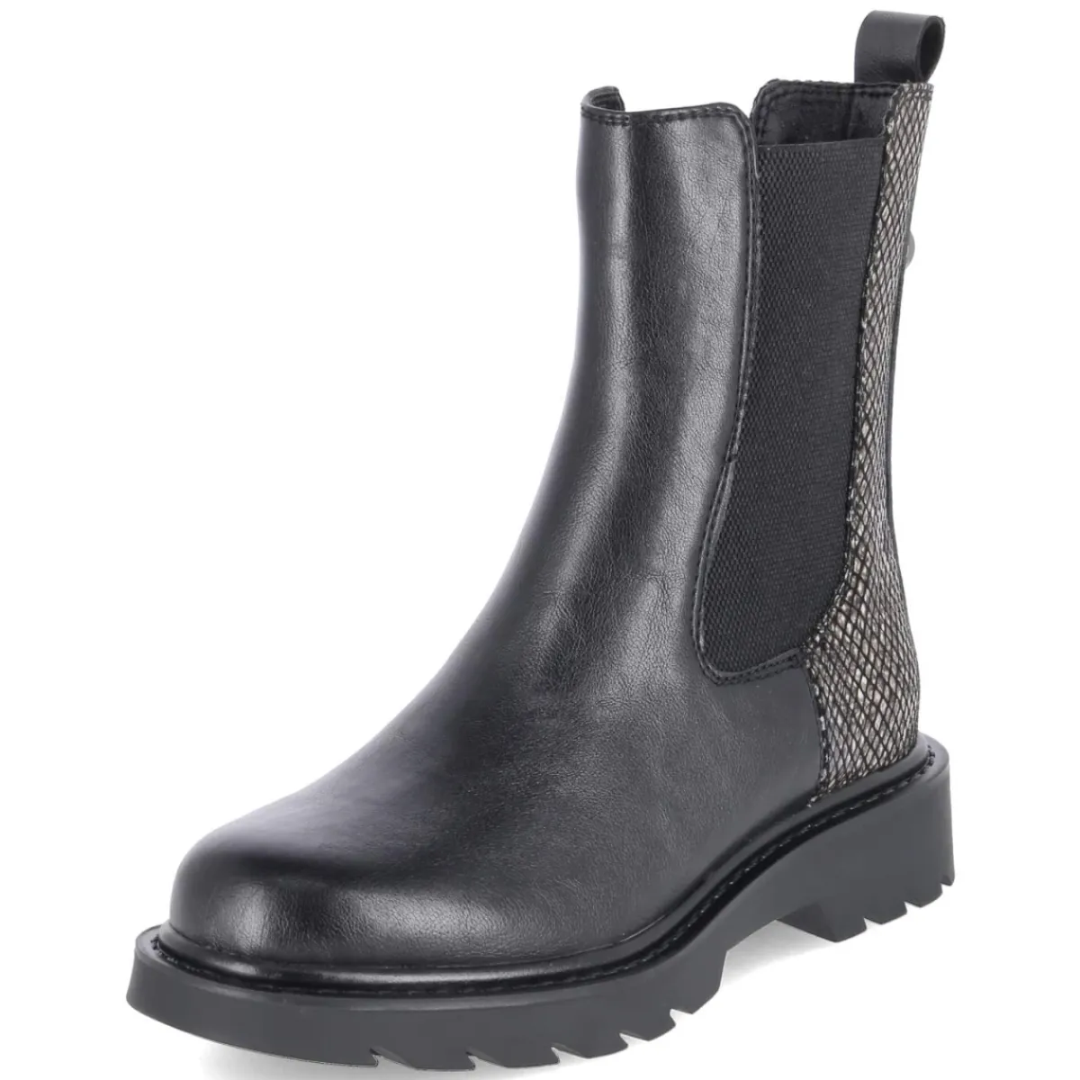 Der Chelsea Boot von Tamaris vereint klares Design mit Komfort und setzt dank der veganen Materialien ein bewusstes Statement. Schwarzes Obermaterial aus Textil und Synthetik, runde Spitze und zwei großflächige Elastikeinsätze sorgen für den charakteristischen Look und einfaches Hineinschlüpfen. Der 4 cm hohe Blockabsatz bietet Stabilität, während die beste Memory-Foam-Fußbettung mit textiler Decksohle den ganzen Tag weich polstert. Eine verstärkte Ferse mit Logo und Anziehlasche, die rutschfeste Profilsohle sowie der hintere Schaft mit subtiler Reptilstruktur in Schlangen-Optik runden das Modell ab. Der Fit fällt größengetreu aus und richtet sich an Erwachsene. Modetipp: Mit Cropped-Jeans und strukturiertem Wollmantel entsteht ein moderner City-Look, ein Satin-Midirock setzt den reptilen Akzent am Schaft elegant in Szene.