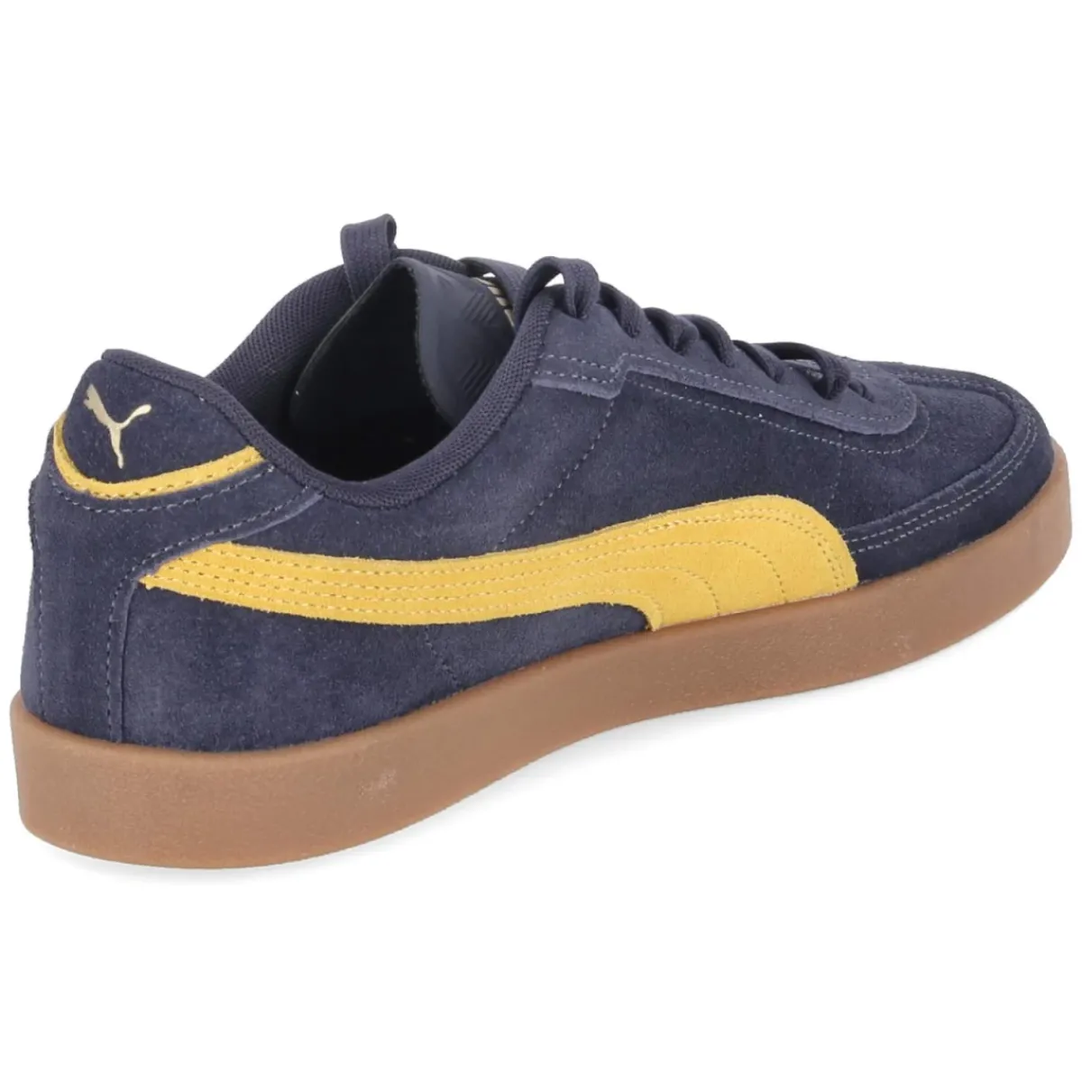 Der Low Sneaker CLUB II ERA SUEDE von Puma setzt mit dunkelblauem Rauleder und gelbem Formstrip ein klares Statement im Retro-Court-Stil. Robustes Echtleder trifft auf runde Schuhspitze und klassische Schnürung, goldene Markendetails unterstreichen den Vintage-Charme. Die rutschfeste, flexible Cupsohle mit Hallenprofil sorgt für zuverlässigen Grip, während verstärkter Fersen- und Zehenbereich die Langlebigkeit erhöht. Innen bietet eine textile Decksohle zusammen mit der besten Memory-Foam-Fußbettung spürbare Dämpfung; das Wechselfußbett lässt sich bei Bedarf einfach entnehmen. Ein gepolsterter Einstieg erhöht den Tragekomfort, die Passform fällt normal aus, Herren ggf. eine halbe Nummer größer wählen. Modetipp: Mit gerader Raw-Denim, weißem T‑Shirt und Collegejacke kommt die Retro-Optik modern zur Geltung; weiße Tennissocken setzen einen authentischen Akzent.