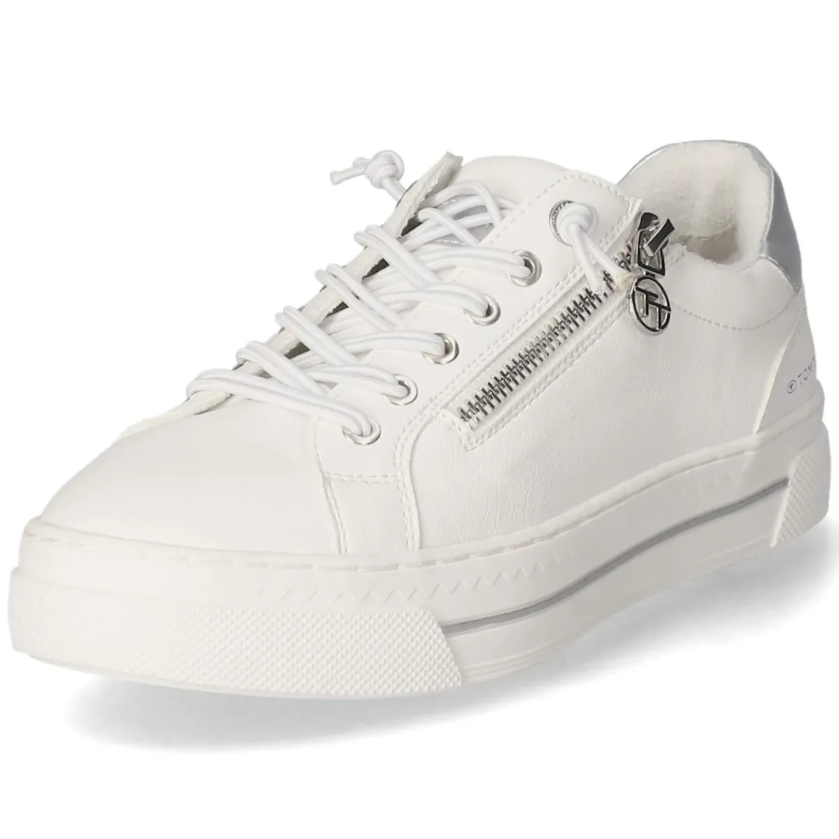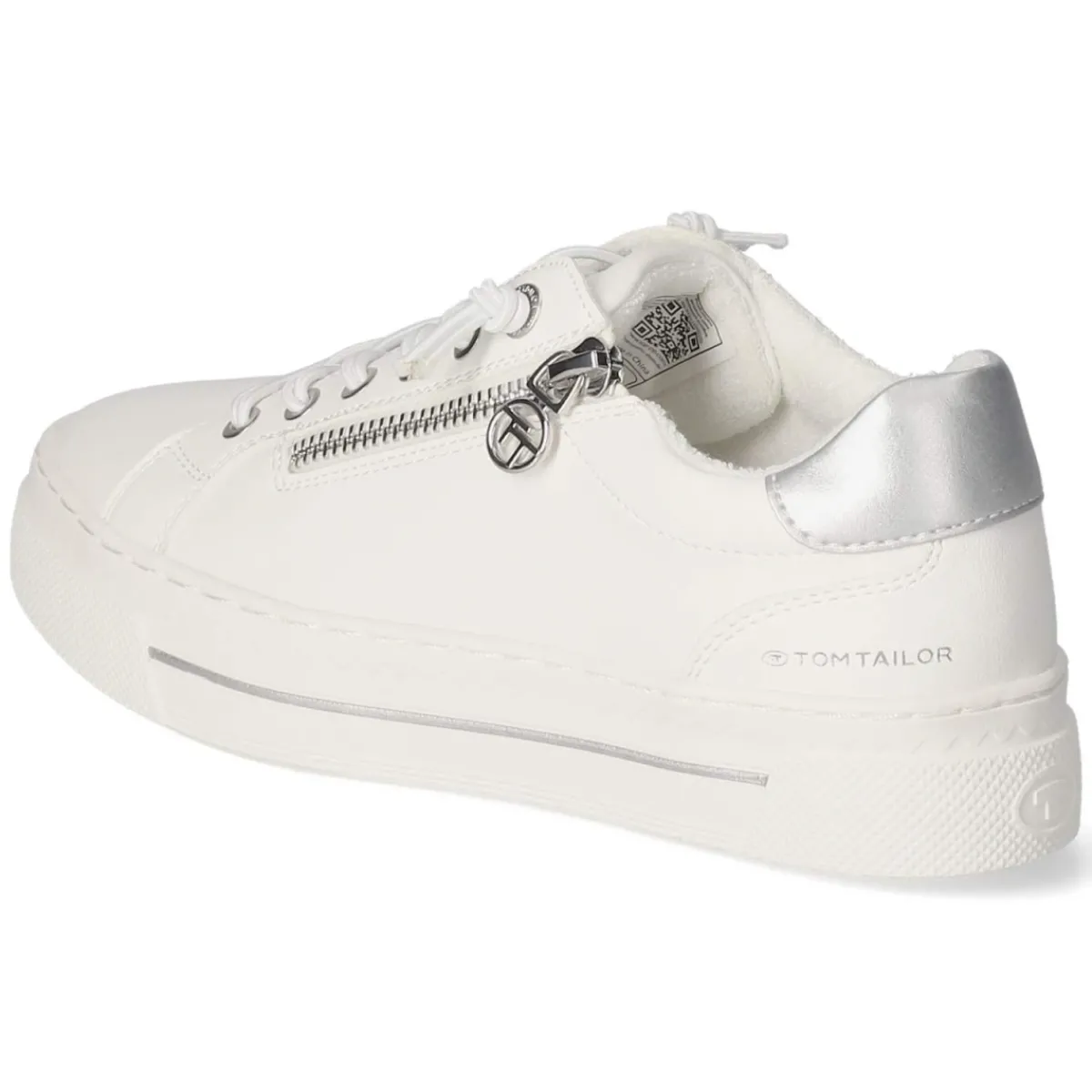 Der Low Sneaker von Tom Tailor vereint cleanes Design und Alltagstauglichkeit. Das weiße Obermaterial aus pflegeleichter Synthetik zeigt sich unempfindlich im täglichen Einsatz, während die runde Schuhspitze und der normal ausfallende Leisten für eine bequeme Passform sorgen. Ein weich gepolsterter Einstieg sowie das gepolsterte Fußbett mit Decksohle aus Textil begleiten durch lange Tage. Schnürsenkel und zusätzlicher Reißverschluss erleichtern das An- und Ausziehen und geben variablen Halt. Eine flexible, rutschhemmende Laufsohle sichert Grip, die verstärkte Ferse stabilisiert jeden Schritt. Silberfarbene Akzente und der Markenanhänger setzen dezente Highlights, die dem minimalistischen Look eine elegante Note verleihen. Modetipp: Für einen frischen City-Look zu hellen Mom-Jeans, gestreiftem Shirt und einer leichten Trenchjacke kombinieren – weiße Socken leicht sichtbar stylen, um den Sneaker akzentuiert in Szene zu setzen.