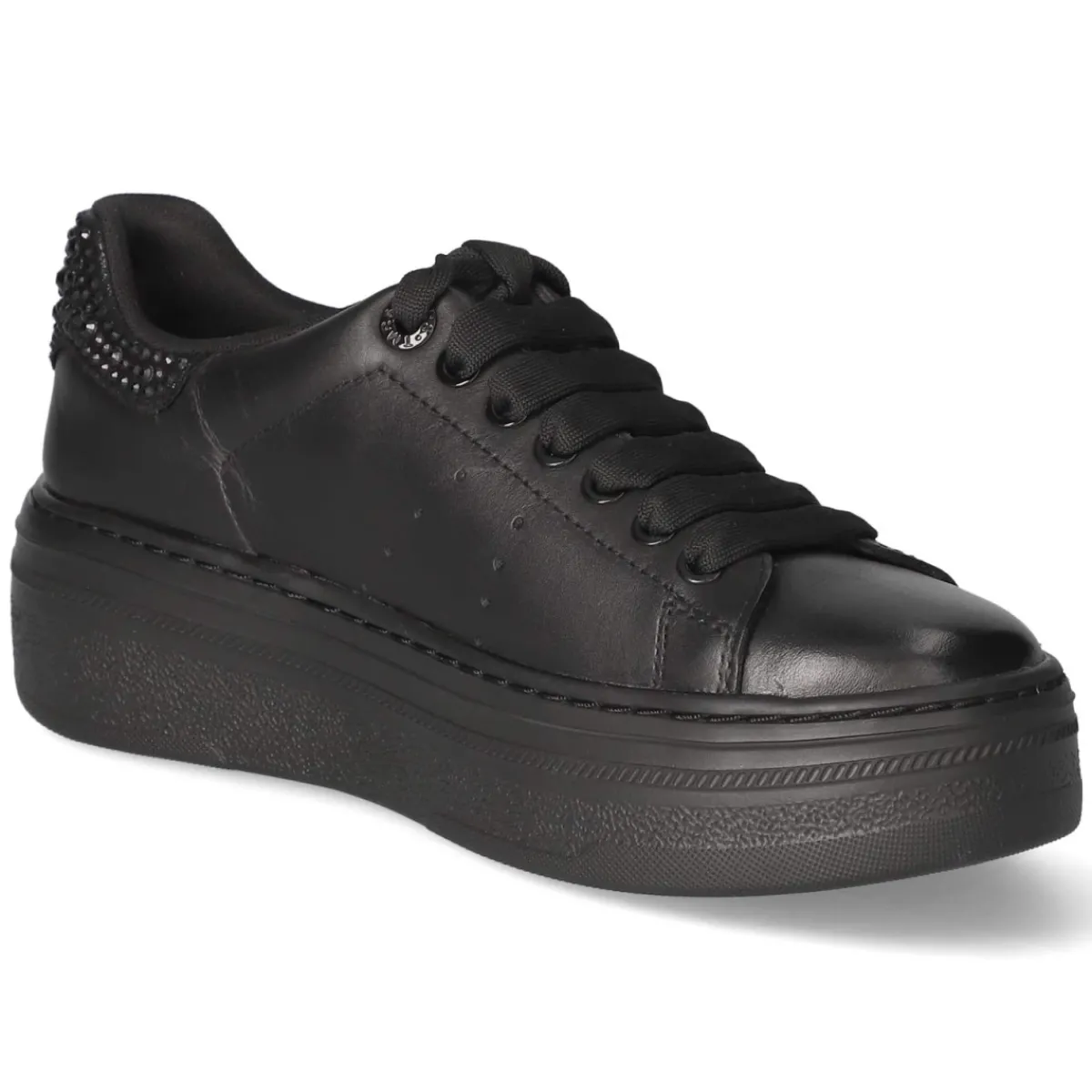Schlichtes Design trifft auf urbanen Chic: Dieser Low Sneaker von Tamaris für Damen präsentiert sich in tiefem Schwarz und überzeugt mit glattem Echtleder, das robusten Alltagseinsatz elegant meistert. Die runde Schuhspitze und der 4,5 cm hohe Plateau-Absatz sorgen für eine moderne Silhouette, während der leicht gepolsterte Einstieg und die rutschfeste Laufsohle Komfort und Halt geben. Dank Schnürung lässt sich der Sitz individuell anpassen, das Wechselfußbett bietet zusätzliche Flexibilität. Die verstärkte Ferse mit feinem Schmucksteinbesatz setzt einen dezenten Akzent. Fällt normal aus und zeigt sich besonders kombinationsfreudig zu Casual- und Smart-Looks. Modetipp: Schwarze Cropped-Jeans, weiße Oversize-Bluse und ein strukturierter Blazer unterstreichen den cleanen Auftritt, ein silbernes Armband greift den Glanz des Fersenbesatzes auf.