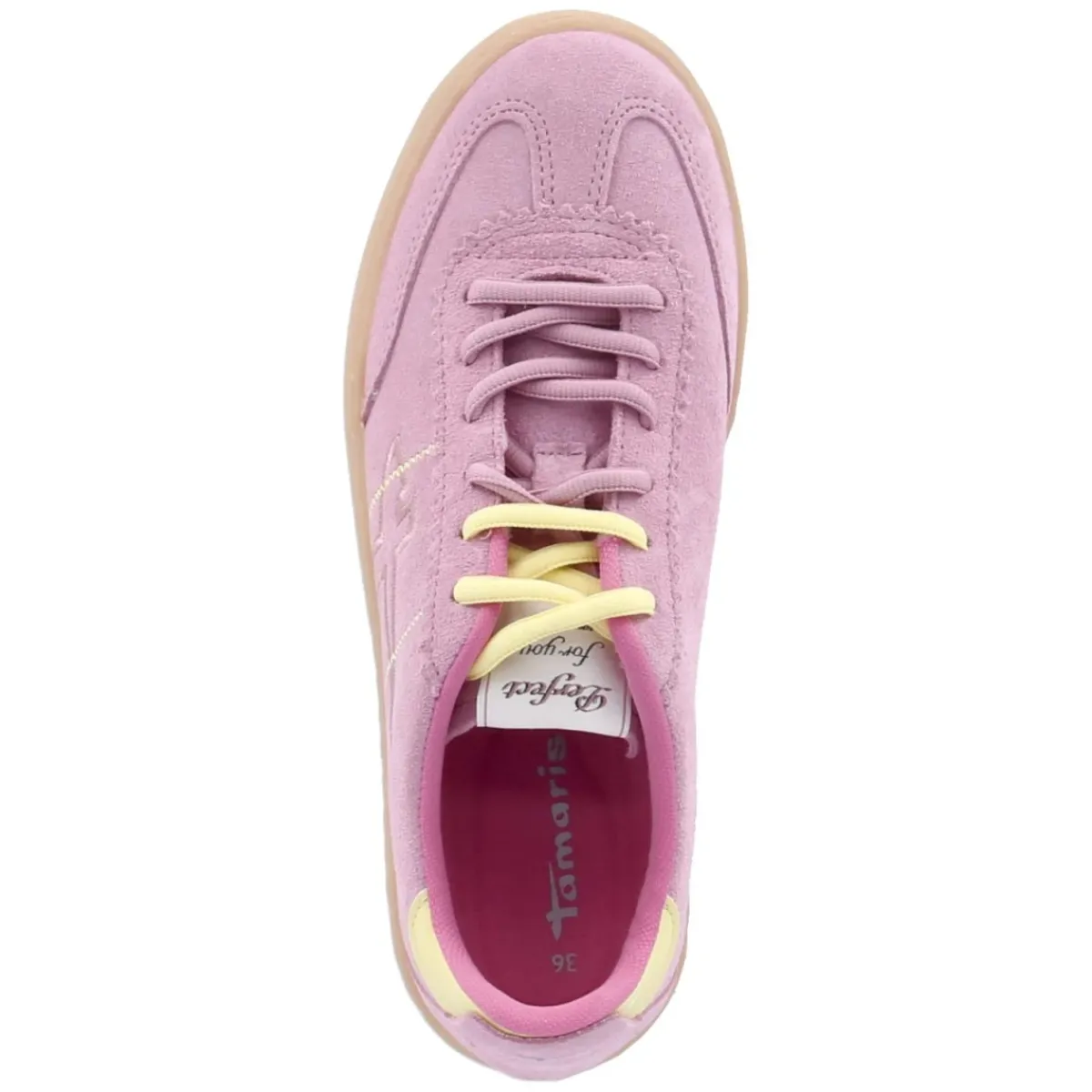 Der Low Sneaker von Tamaris verbindet eine trendige Retro-Optik mit durchdachtem Komfort. Das Obermaterial aus Leder und Synthetik bildet einen robusten Material-Mix, während die runde Schuhspitze und der gepolsterte Einstieg für ein angenehmes Tragegefühl sorgen. Ein geringes Gewicht macht den Auftritt besonders leicht, das komfortable Wechselfußbett mit textiler Decksohle lässt sich unkompliziert austauschen. Der schnürbare Verschluss bietet Halt, zwei Paar Schnürsenkel in Rosa und Gelb eröffnen variable Looks. Gelbe Elemente und das Seitenlogo setzen frische Akzente, verstärkte Zonen an Ferse und Zehen erhöhen die Langlebigkeit. Die Passform fällt normal aus und macht den Sneaker zum unkomplizierten Allrounder für Damen. Modetipp: Mit weitem Mom-Jeans-Schnitt und einem kurz geschnittenen Cardigan entsteht ein authentischer 90s-Style, der die pinke Farbe effektvoll in Szene setzt.
