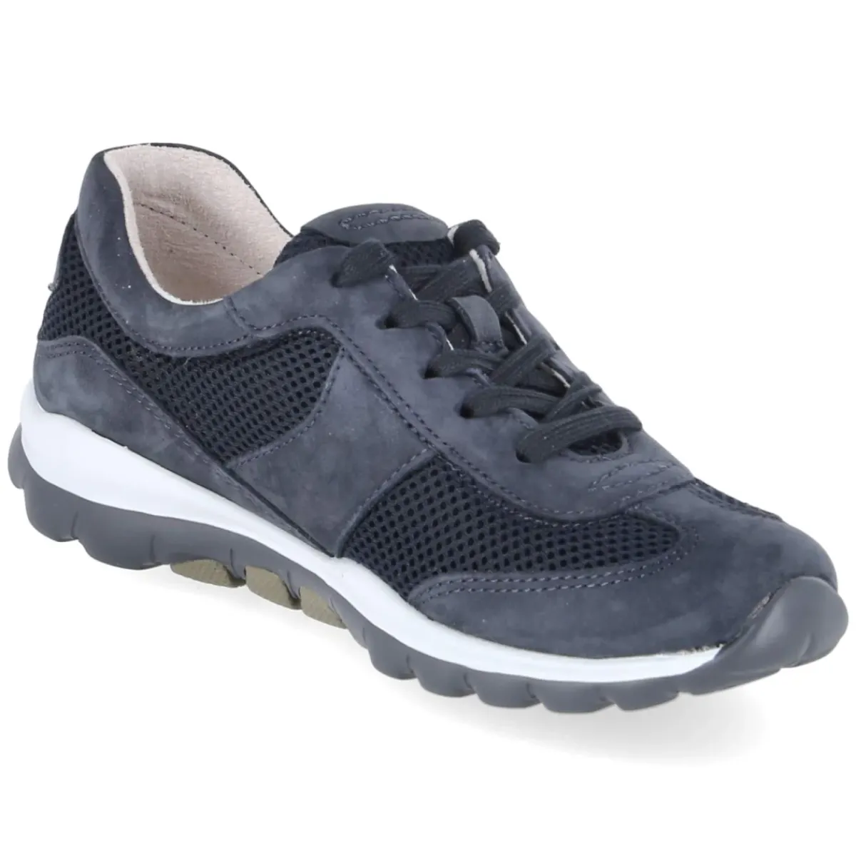 Der Low Sneaker von Gabor zeigt in Blau eine moderne Verbindung aus Leder und Textil, akzentuiert durch Strick-Optik und luftige Mesh-Teile. Die runde Schuhspitze und die klassische Schnürung geben einen sportlich-femininen Look, während der leicht gepolsterte Einstieg und der verstärkte Fersen- und Zehenbereich für angenehmen Halt sorgen. Als relaxtes Leichtgewicht bietet das Modell spürbare Bequemlichkeit im Alltag. Die flexible Laufsohle in Kombination mit Rollingsoft unterstützt eine natürliche Abrollbewegung, das komfortable Wechselfußbett mit Lederdecksohle erhöht den Tragekomfort und lässt sich bei Bedarf austauschen. Der Fit fällt normal aus, dadurch bleibt die Passform unkompliziert. Modetipp: Mit Cropped-Jeans in Grautönen und einem feinen Strickpullover entsteht ein harmonischer Ton-in-Ton-Look; ein beiger Trench setzt einen eleganten Kontrast zum Blau des Sneakers.