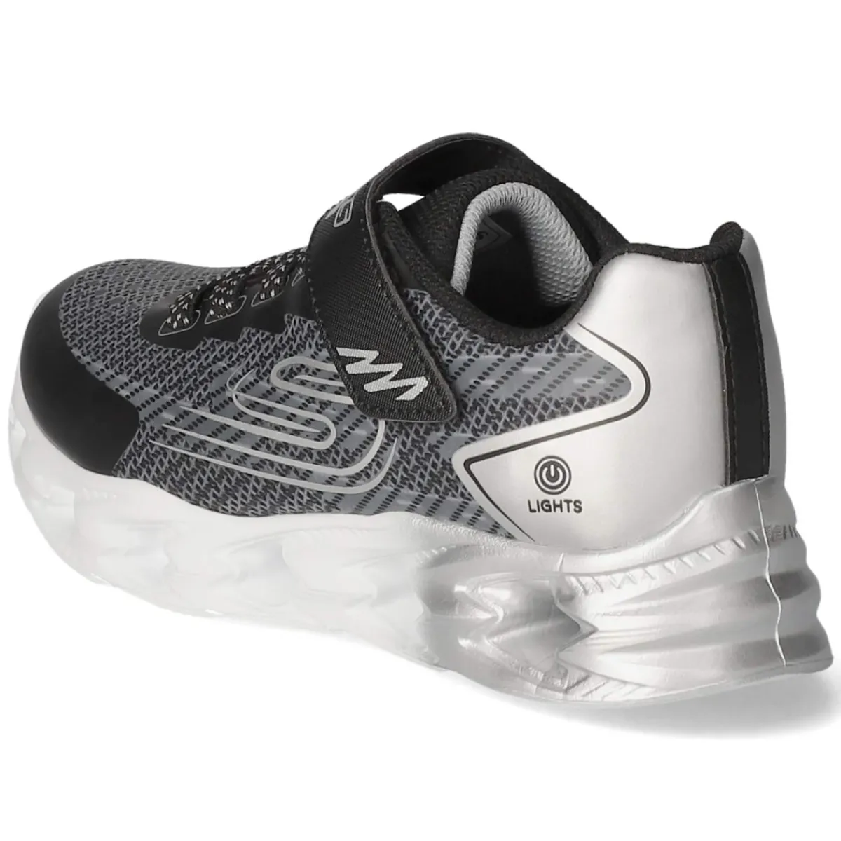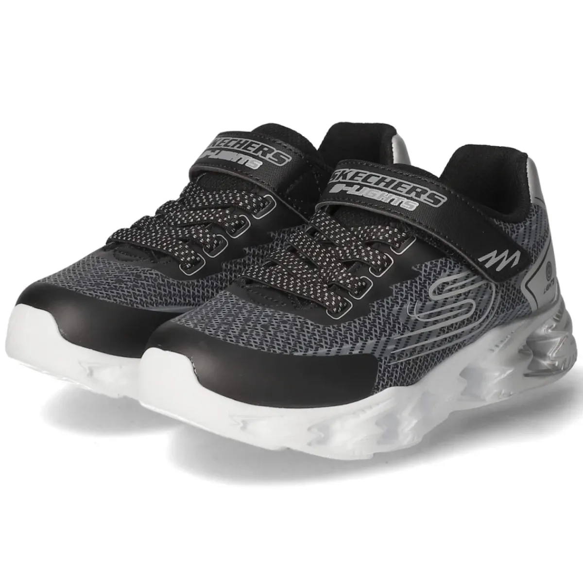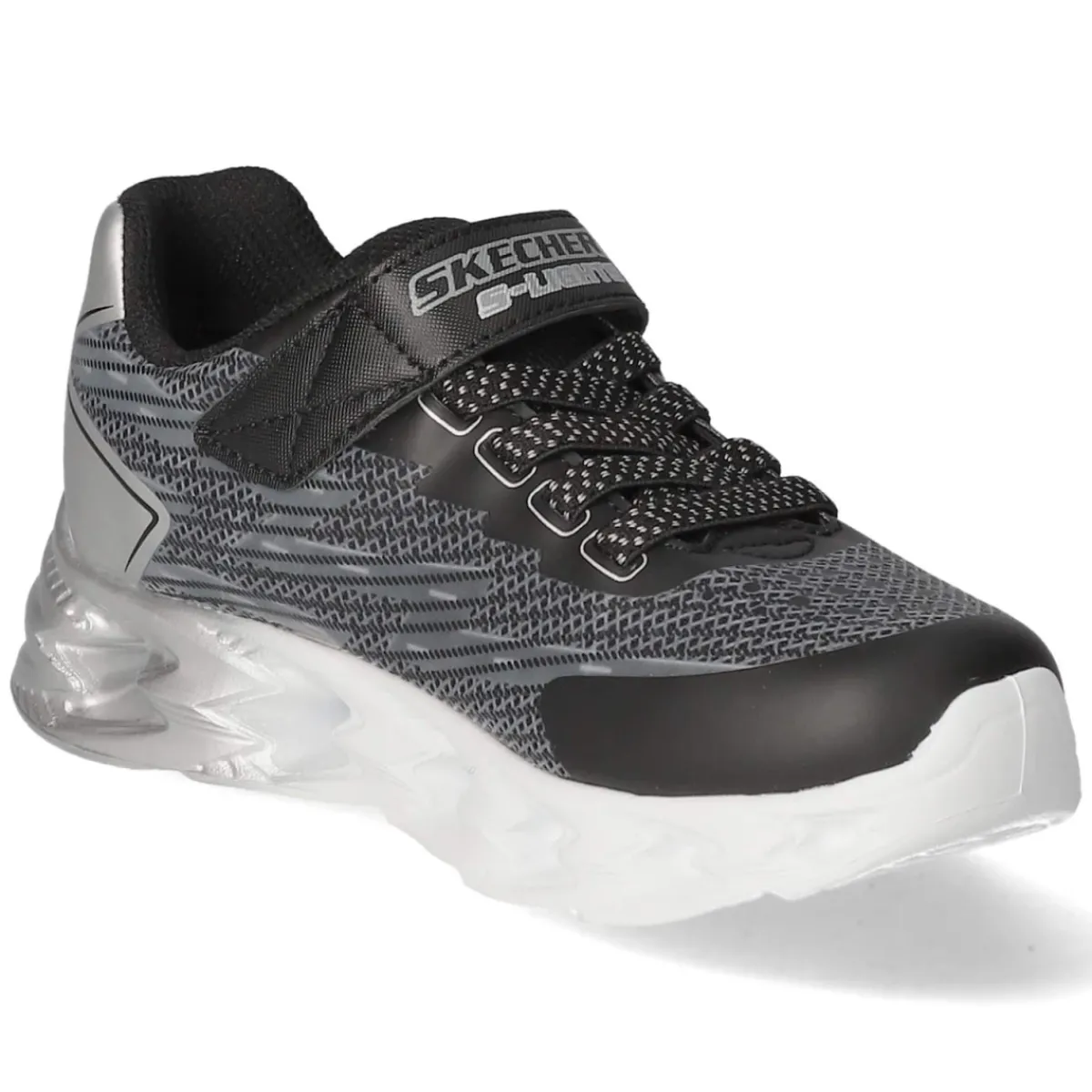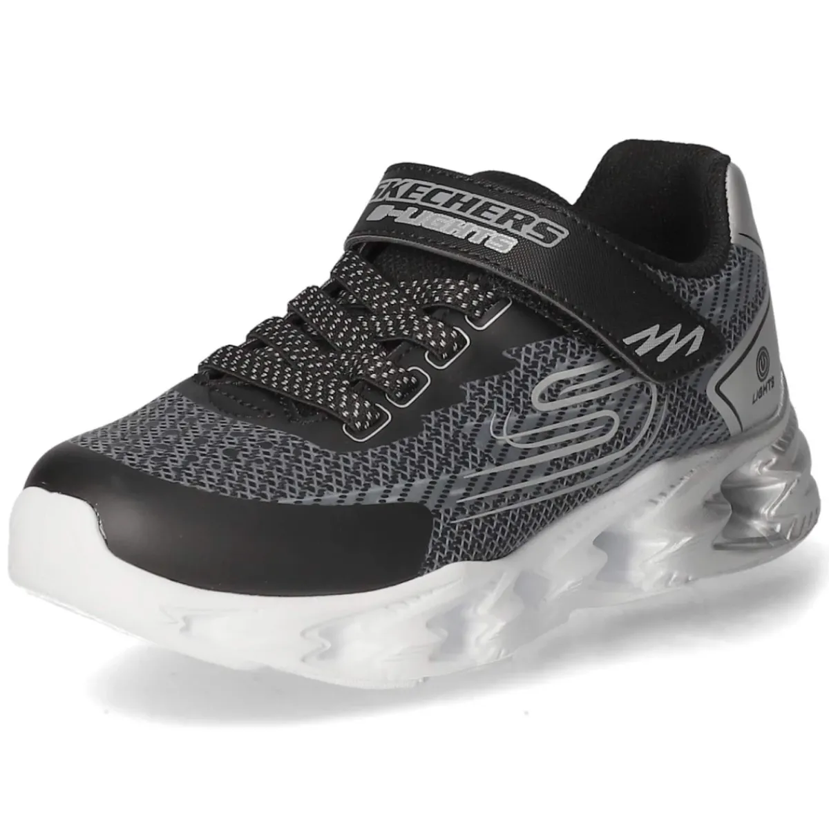 Der Skechers Low Sneaker VORTEX 2.0 bringt Bewegung ins Spiel: Das robuste Synthetik-Obermaterial sorgt gemeinsam mit der verstärkten Ferse für Formstabilität, während der leicht gepolsterte Einstieg und die textile, weich gepolsterte Decksohle hohen Tragekomfort sichern. Elastikschnürung und bequemer Klettverschluss ermöglichen einen schnellen, sicheren Halt – ideal, da der Schuh normal ausfällt. Highlight sind die blinkenden LEDs in der Sohle, die über einen praktischen On/Off-Schalter gesteuert werden können. Die flexible, rutschhemmende NON-MARKING Laufsohle hinterlässt keine Spuren und bietet zuverlässigen Grip in Schule, Kita und Halle. Markendetails und die runde Schuhspitze runden das Design in klassischem Schwarz ab. Modetipp: Zu dunklen Slim-Jeans, farbigen Sportsocken und einer leichten Bomberjacke kommt der LED-Effekt besonders gut zur Geltung.