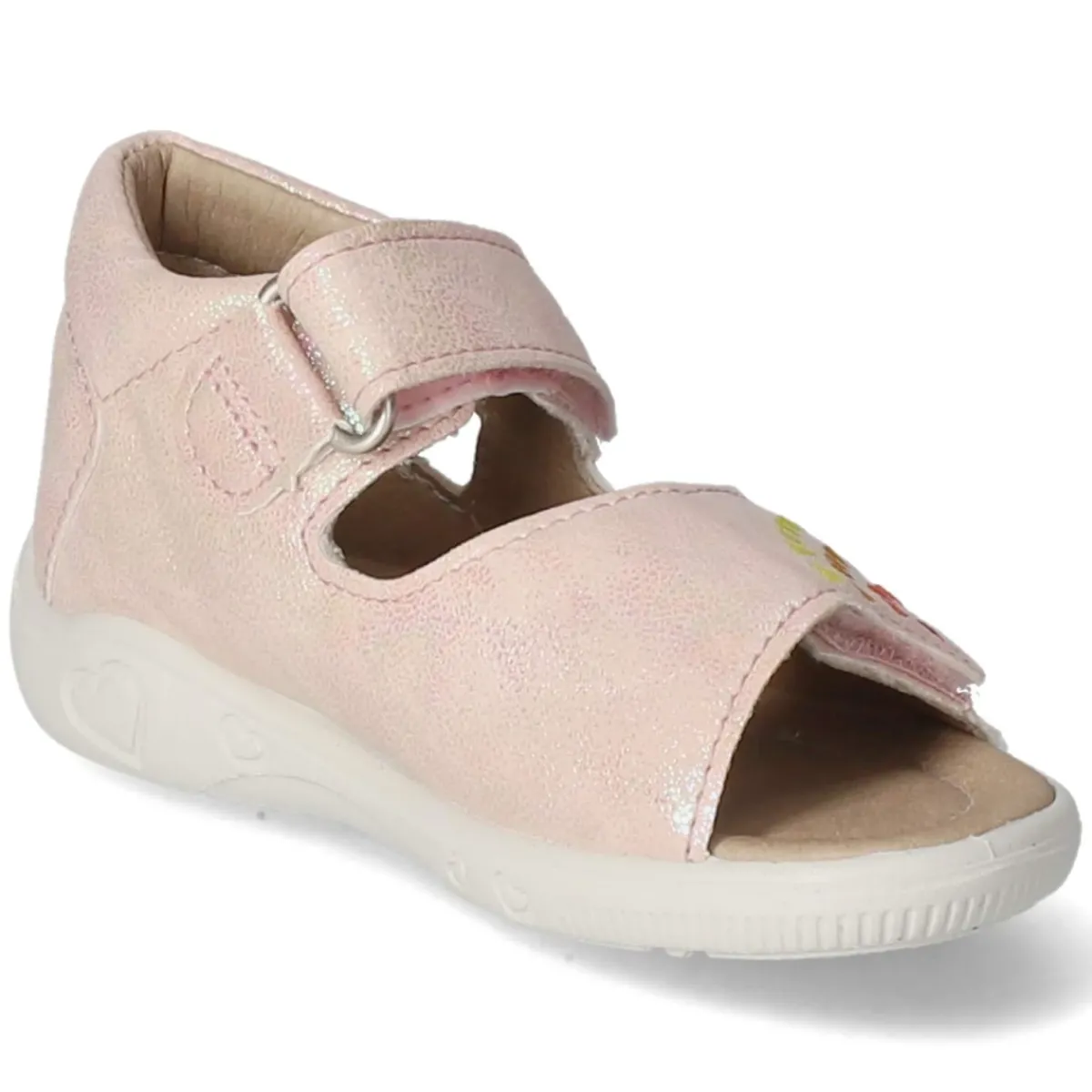 Die Miniletten TIANA von Pepino verbinden spielerische Optik mit durchdachtem Komfort. Das rosafarbene Obermaterial aus Synthetik zeigt eine elegant schimmernde Oberfläche mit regenbogenfarbenem Glitzerschimmer, akzentuiert von buntfarbenen Herzchen und Markendetails. Zwei praktische Klettverschlüsse erleichtern das An- und Ausziehen und sorgen in Kombination mit der mittleren Weite für einen sicheren Halt. Das weich gepolsterte Fußbett sowie die synthetische Decksohle bieten bequemen Auftritt für lange Tage. Eine flexible, rutschhemmende Laufsohle und die verstärkte Ferse unterstützen Stabilität und Bewegungsfreiheit, während die offene Schuhspitze sommerliche Leichtigkeit bringt. Der Schnitt fällt normal aus und passt vielfältigen Kinderfüßen. Modetipp: Zu luftigen Sommerkleidern oder Denim-Shorts und einem leichten Cardigan kommt der glitzernde Rosaton besonders gut zur Geltung.