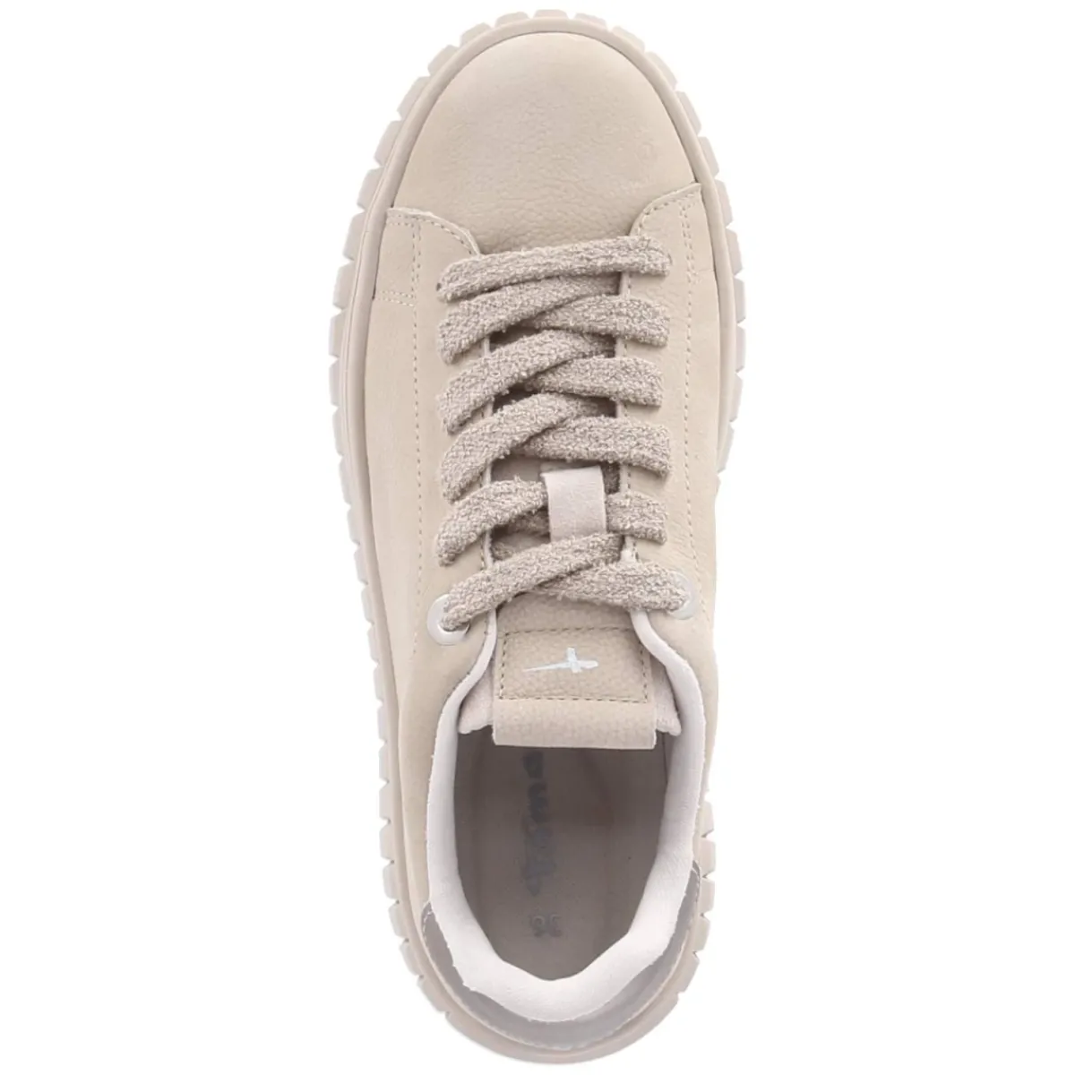 Der Plateau Sneaker von Tamaris verbindet feminine Leichtigkeit mit urbaner Lässigkeit. Das beige Rauleder zeigt eine samtige Oberfläche und verleiht der modernen Optik eine edle Note. Der 4 cm hohe Plateau-Absatz sorgt für angenehme Höhe und ein stimmiges Profil, unterstützt von einer rutschfesten Plateausohle. Eine runde Schuhspitze und die klassische Schnürung bieten entspannten Komfort, während der leicht gepolsterte Einstieg und die verstärkte Ferse Stabilität geben. Raffiniert wirkt die metallisch glänzende Fersenklappe mit dezenten Markendetails. Die textile Decksohle und das komfortable, herausnehmbare Wechselfußbett erhöhen den Tragekomfort im Alltag. Fällt größengetreu aus und begleitet mühelos vom City-Look bis zum Casual Friday. Modetipp: mit Cropped-Jeans und Oversize-Blazer in warmen Neutraltönen kombinieren.