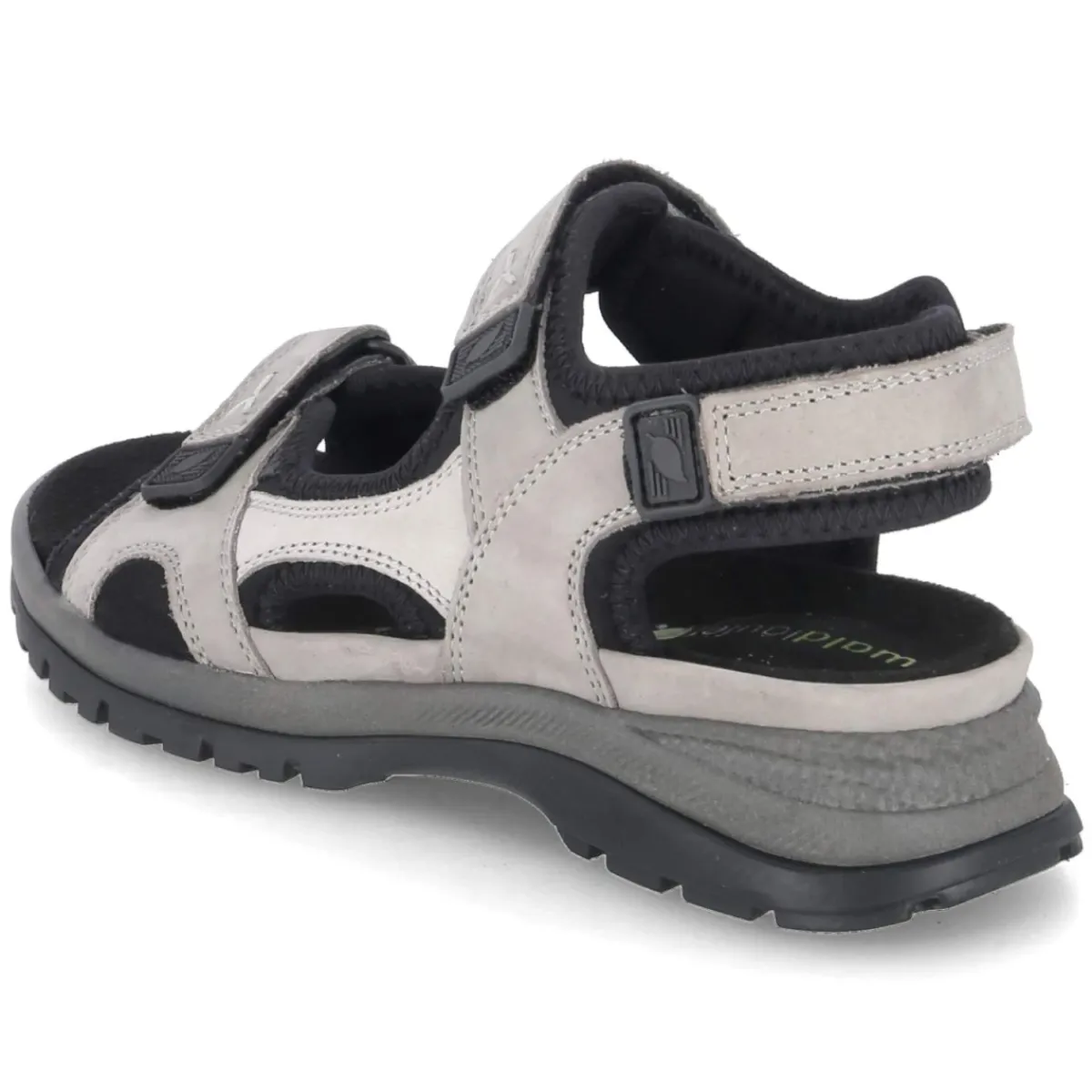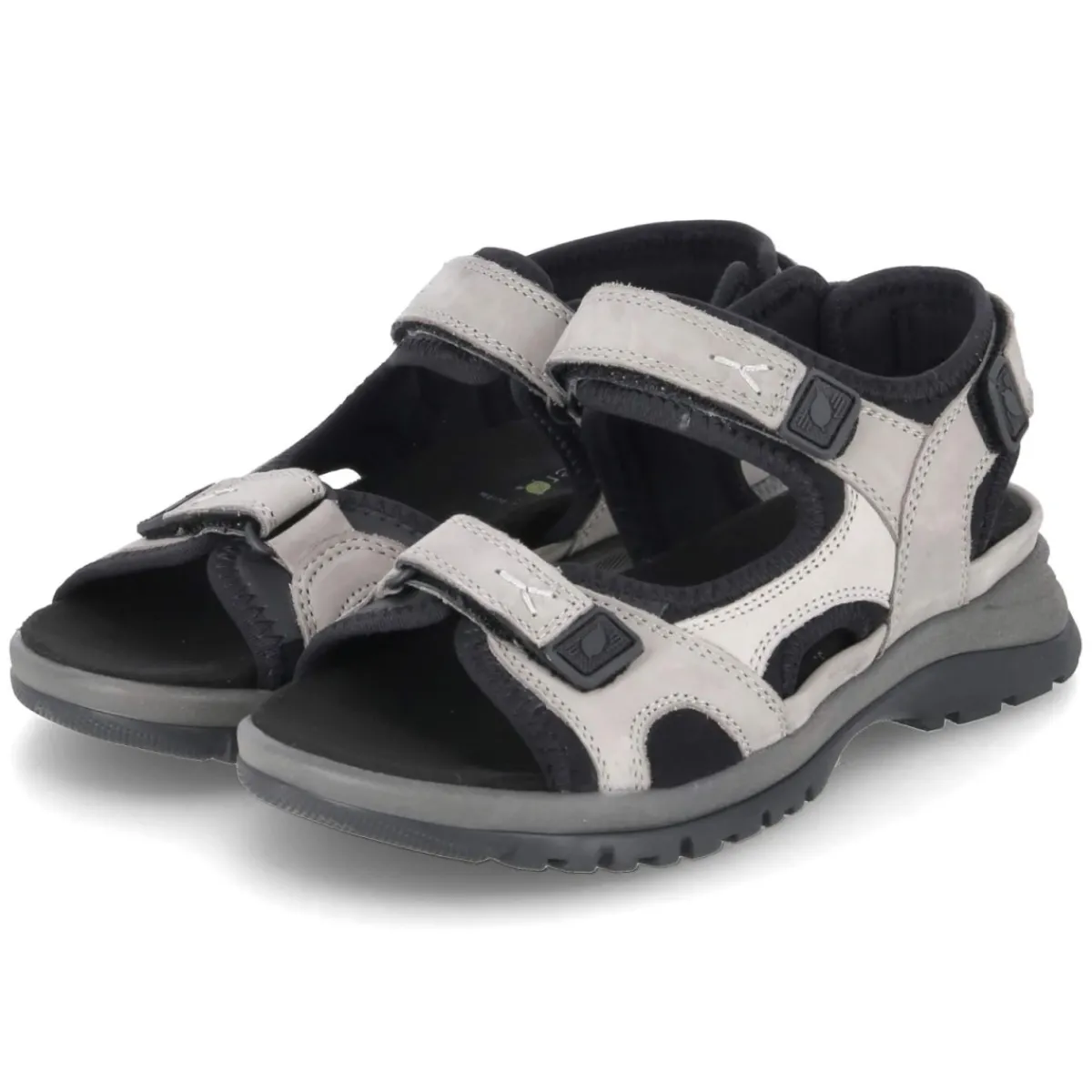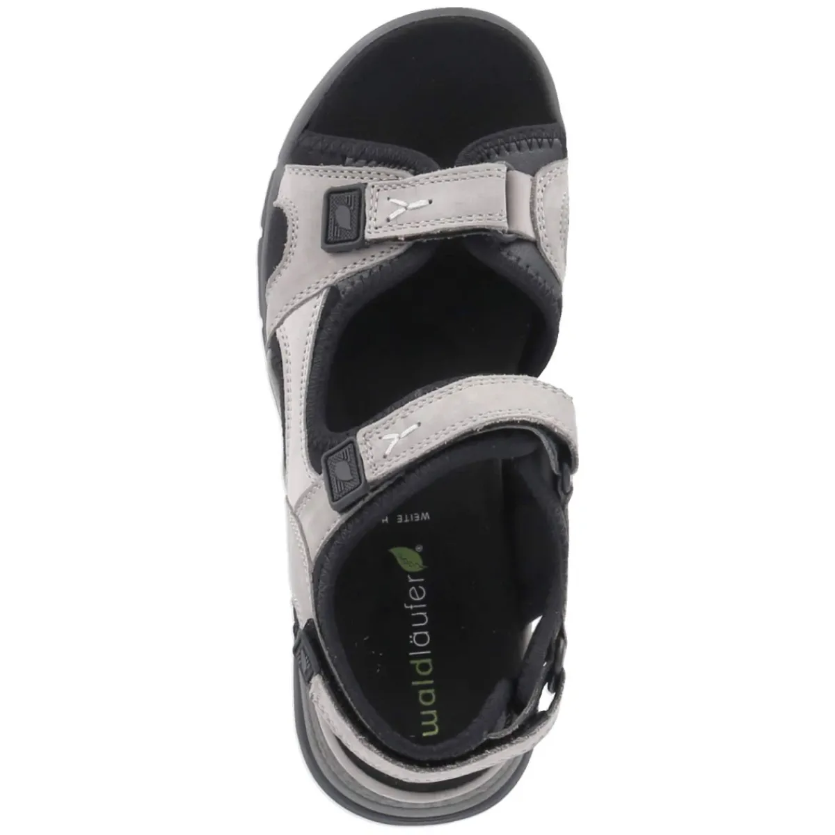Die Sandalen H-SORA von Waldläufer verbinden sommerliche Leichtigkeit mit verlässlichem Komfort. Das graue Obermaterial aus hochwertigem Rauleder zeigt sich langlebig und anschmiegsam, während die offene Schuhspitze für angenehme Luftzirkulation sorgt. Drei praktische Klettverschlüsse erlauben passgenaue Justierung, der seitliche Steg stabilisiert unauffällig. Ein komfortables Wechselfußbett schafft wohltuende Dämpfung und lässt sich bei Bedarf durch eigene Einlagen ersetzen; die textile Decksohle und das leichte Futter steigern den Tragekomfort zusätzlich. Die flexible, rutschhemmende Profillaufsohle bietet soliden Grip auf verschiedensten Untergründen und unterstreicht den alltagstauglichen Charakter. Dezente Ziernähte geben dem Modell eine moderne, ruhige Note. Der Schnitt fällt normal aus. Modetipp: Ton in Ton mit grauer Leinenhose und weißem Hemd wirkt der Look edel, ein Akzentgürtel in Silber komplettiert das Outfit.