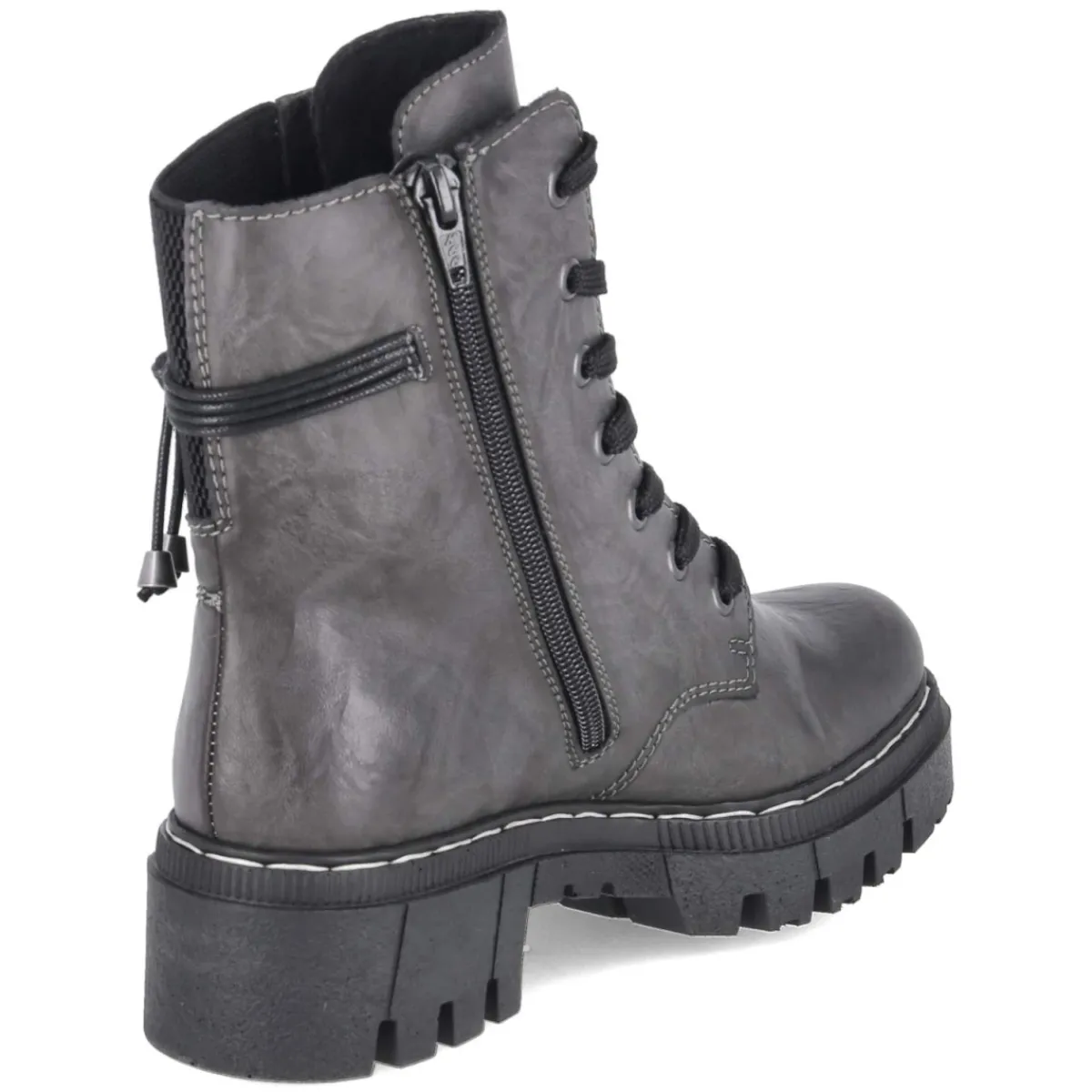 Diese grauen Schnürboots von Rieker setzen auf einen gelungenen Mix aus Komfort und urbanem Stil. Das pflegeleichte Synthetik-Obermaterial zeigt eine leichte Knautschoptik, während der 5 cm hohe Blockabsatz mit kleinem Plateau dezent streckt und sicheren Stand vermittelt. Dank rutschfester Profilsohle, verstärktem Fersenbereich und rund gearbeiteter Spitze entsteht ein stabiles, entspanntes Laufgefühl. Das relaxtes Leichtgewicht punktet mit weichem Fußbett und Textil-Decksohle, das leichte Futter wärmt an kühlen Tagen. Schnürsenkel in Kombination mit Reißverschluss erleichtern den Einstieg und erlauben eine passgenaue Regulierung; ein seitlicher Stretcheinsatz sowie ein zierendes Band ergänzen das Design. Die Passform fällt normal aus und bietet verlässliche Größe. Modetipp: Zu grauen Wide-Leg-Jeans, meliertem Strickpullover und langem Wollmantel in Creme entsteht ein harmonischer Ton-in-Ton-Look mit modernem Finish.