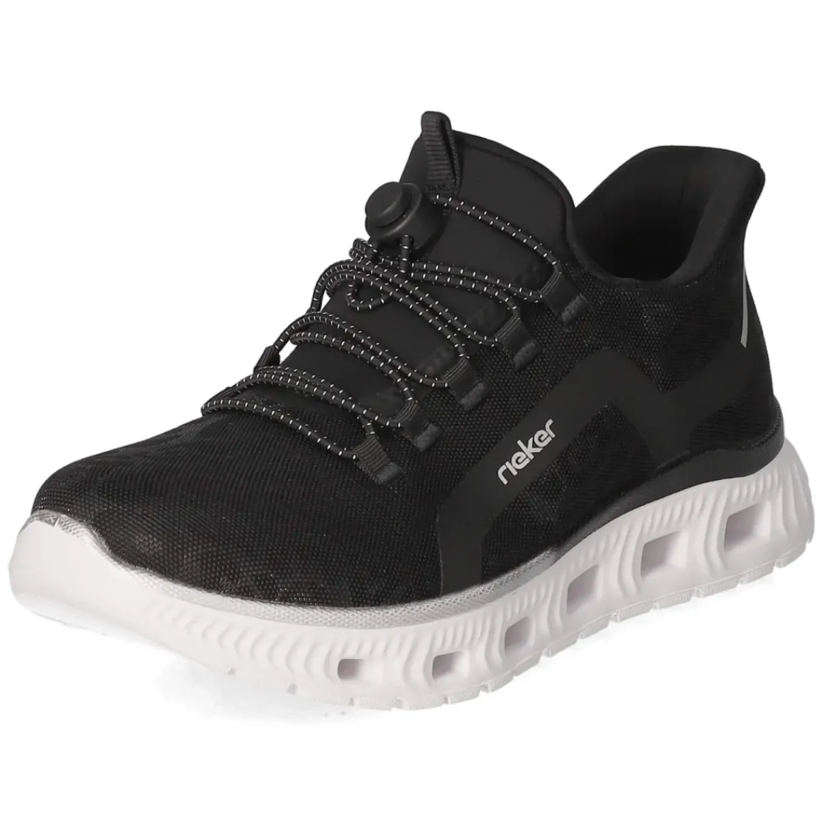 Der Slip on Sneaker von Rieker in tiefem Schwarz verbindet sportliche Leichtigkeit mit urbanem Chic. Das leichte Obermaterial aus Textil und Synthetik schmiegt sich angenehm an den Fuß, während die runde Schuhspitze und das gepolsterte Fußbett für entspanntes Tragegefühl im Alltag sorgen. Dank flexiblem Schnellverschluss und Anziehlasche gelingt das Hineinschlüpfen im Handumdrehen, die flexible, rutschhemmende Laufsohle liefert zuverlässigen Grip. Glänzende Akzente und eine dezente Animaloptik setzen subtile Highlights, Markendetails runden den Look ab. Die Passform fällt normal aus, die textile Decksohle erhöht den Komfort auch bei längeren Wegen. Ein vielseitiger Damen-Sneaker, der Büro, City und Freizeit mühelos verbindet. Modetipp: Mit verkürzter Straight-Jeans und Oversize-Blazer entsteht ein smarter Kontrast, monochrom in Schwarz mit silbernen Accessoires wirkt der Look besonders modern.
