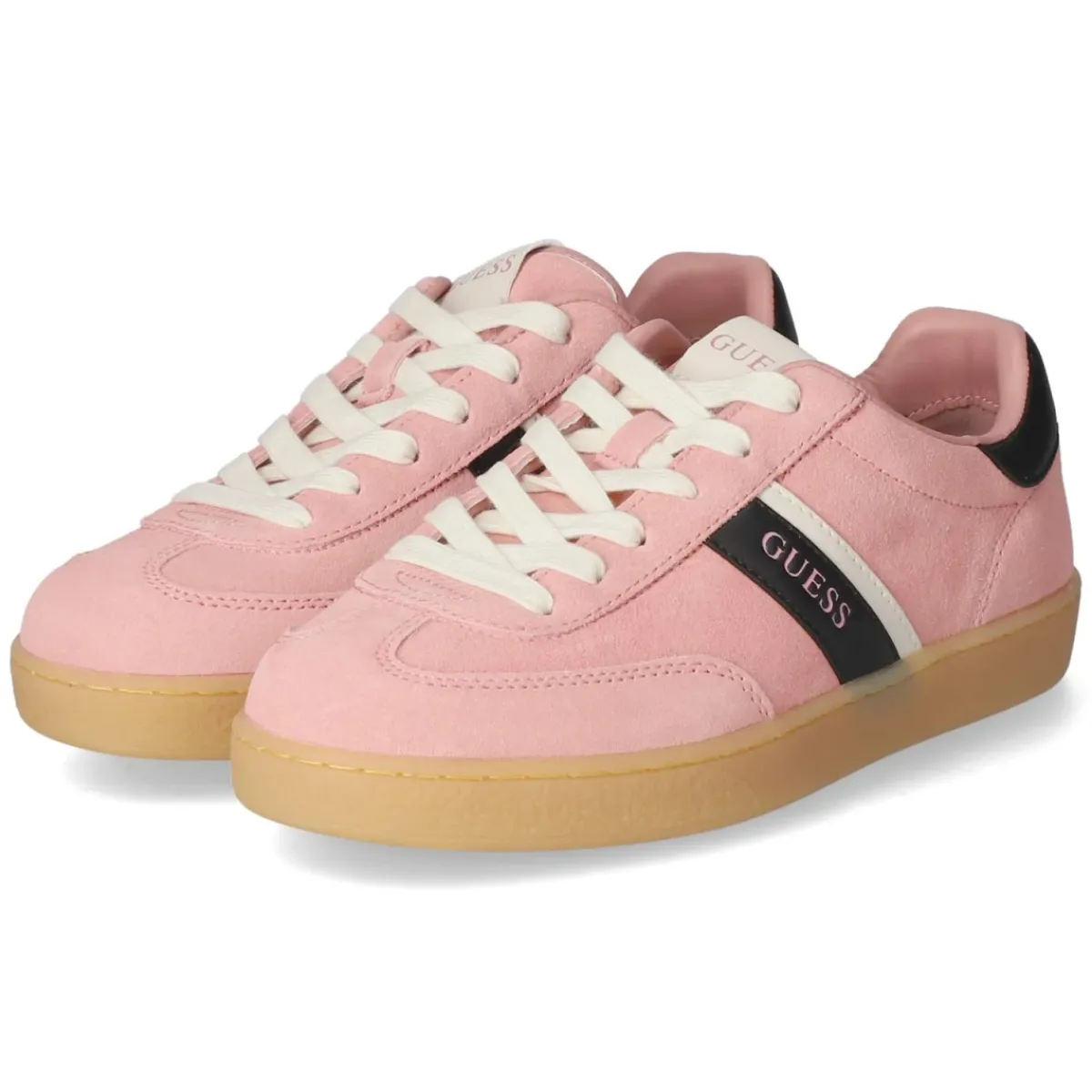 Der Guess Sneaker in zartem Pink verbindet sportliche Linien mit einer femininen Note. Weiches Rauleder aus atmungsaktivem Echtleder umschließt den Fuß, schwarze Zierstreifen mit Markenlogo setzen einen markanten Kontrast. Der runde Zehenbereich ist zusätzlich verstärkt, ebenso die Ferse in glattem Leder, was Formstabilität und Langlebigkeit unterstützt. Ein gepolsterter Einstieg und die textile Decksohle über dem komfortabel gepolsterten, herausnehmbaren Wechselfußbett sorgen für angenehmen Auftritt, während die Schnürung eine individuelle Anpassung ermöglicht. Die flexible, rutschhemmende Laufsohle bietet verlässlichen Halt im Alltag. Der Leisten fällt normal aus und lässt sich unkompliziert kombinieren. Modetipp: Für einen frischen City-Look den Pinkton mit weißen Wide-Leg-Jeans und einem schwarzen Blazer aufgreifen, sodass die dunklen Logo-Streifen stilvoll wiederholt werden.