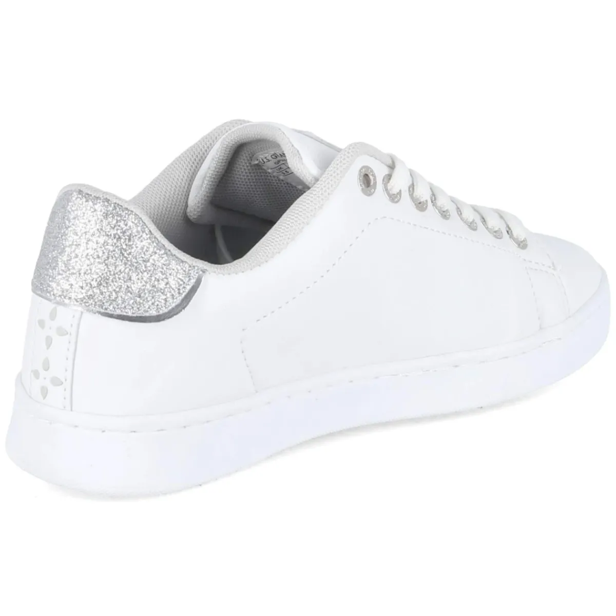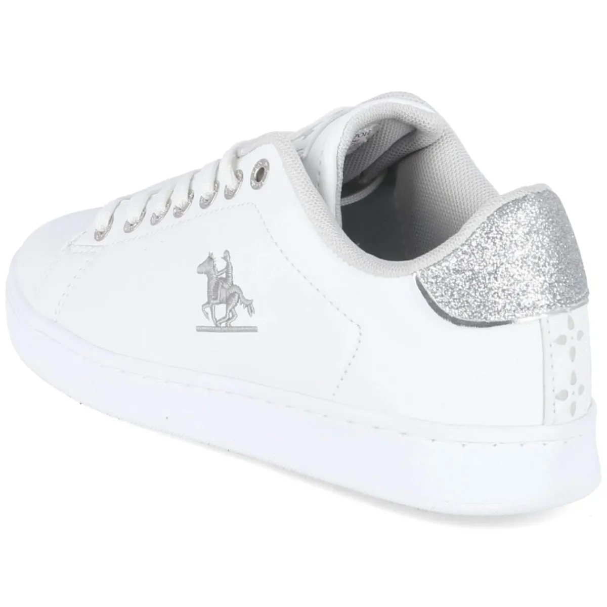 Der Sneaker EMPIRE von U.S. Grand Polo setzt auf ein cleanes Weiß, das von einer silbern glitzernden Fersenklappe akzentuiert wird. Das Obermaterial aus Synthetik zeigt eine pflegeleichte Oberfläche, während der gepolsterte Einstieg und die verstärkte Ferse angenehmen Halt versprechen. Die runde Schuhspitze und die klassische Schnürung ermöglichen eine individuelle Anpassung, ergänzt durch ein gepolstertes, herausnehmbares Fußbett mit textiler Decksohle. Eine rutschfeste Laufsohle sorgt für Trittsicherheit im Alltag. In der Passform fällt das Damenmodell normal aus und begleitet Erwachsene souverän durch Büro, Freizeit und City. Markendetails runden den modernen Look ab und verleihen dem Schuh eine sportlich-elegante Note. Modetipp: Ton-in-Ton mit weißer Cropped-Jeans und einem cremefarbenen Stricktop getragen entsteht ein frischer, urbaner Auftritt; ein Denim-Blouson setzt einen lässigen Kontrast.