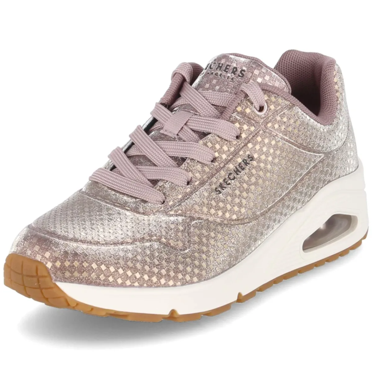 Der Skechers UNO- DISCO NITE setzt ein strahlendes Statement in Gold und vereint glamouröses Design mit wohltuendem Tragekomfort. Das Obermaterial aus Synthetik zeigt dynamische Prägungen und roségoldene Akzente, die dem Sneaker eine edle Tiefe verleihen. Eine runde Schuhspitze und der klassische Schnürverschluss sorgen für eine zeitlose, sportliche Silhouette. Das Beste: Die weiche Memory-Foam-Fußbettung polstert jeden Schritt, während ein gepolsterter Einstieg sowie verstärkte Zehen- und Fersenbereiche zuverlässigen Halt bieten. Die rutschhemmende Profilsohle mit Sichtfenster in der Ferse sorgt für Grip und einen markanten Look. Pflegeleichte Oberfläche und normal ausfallende Passform erleichtern den Alltag. Modetipp: In Kombination mit dunkel gewaschener Denim und einem seidigen Creme-Blazer entsteht ein lässiger Glam-Mix, der tagsüber ebenso wirkt wie abends.