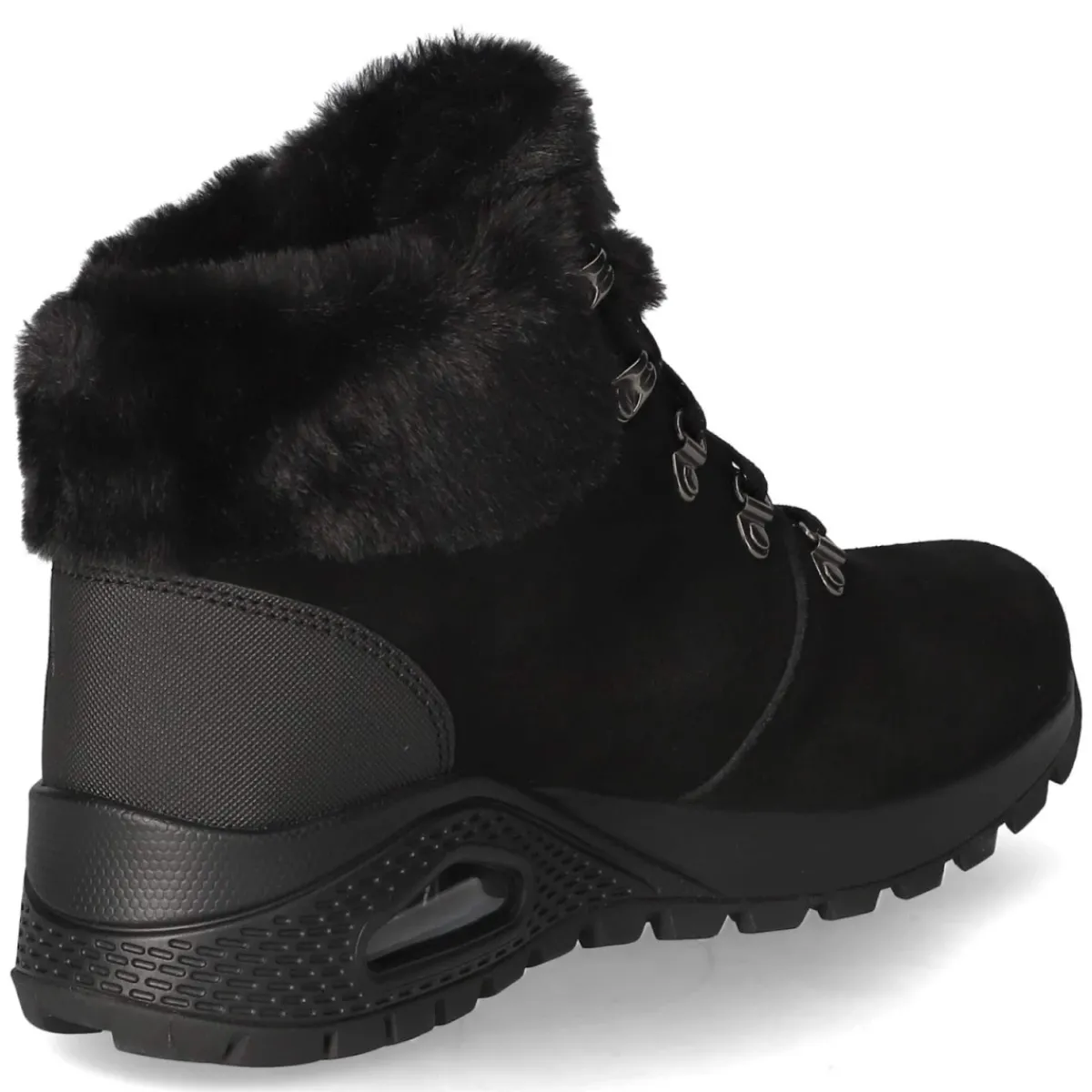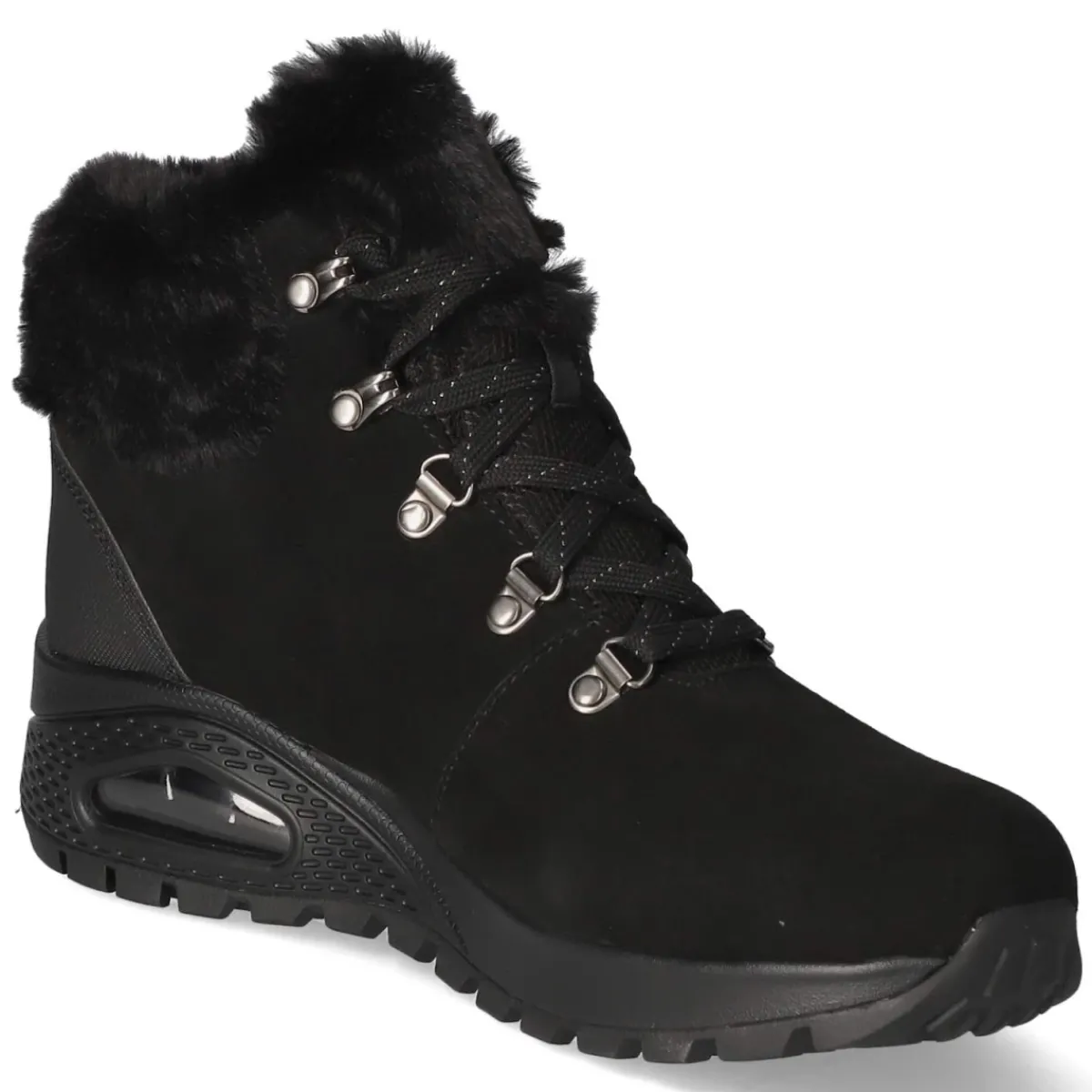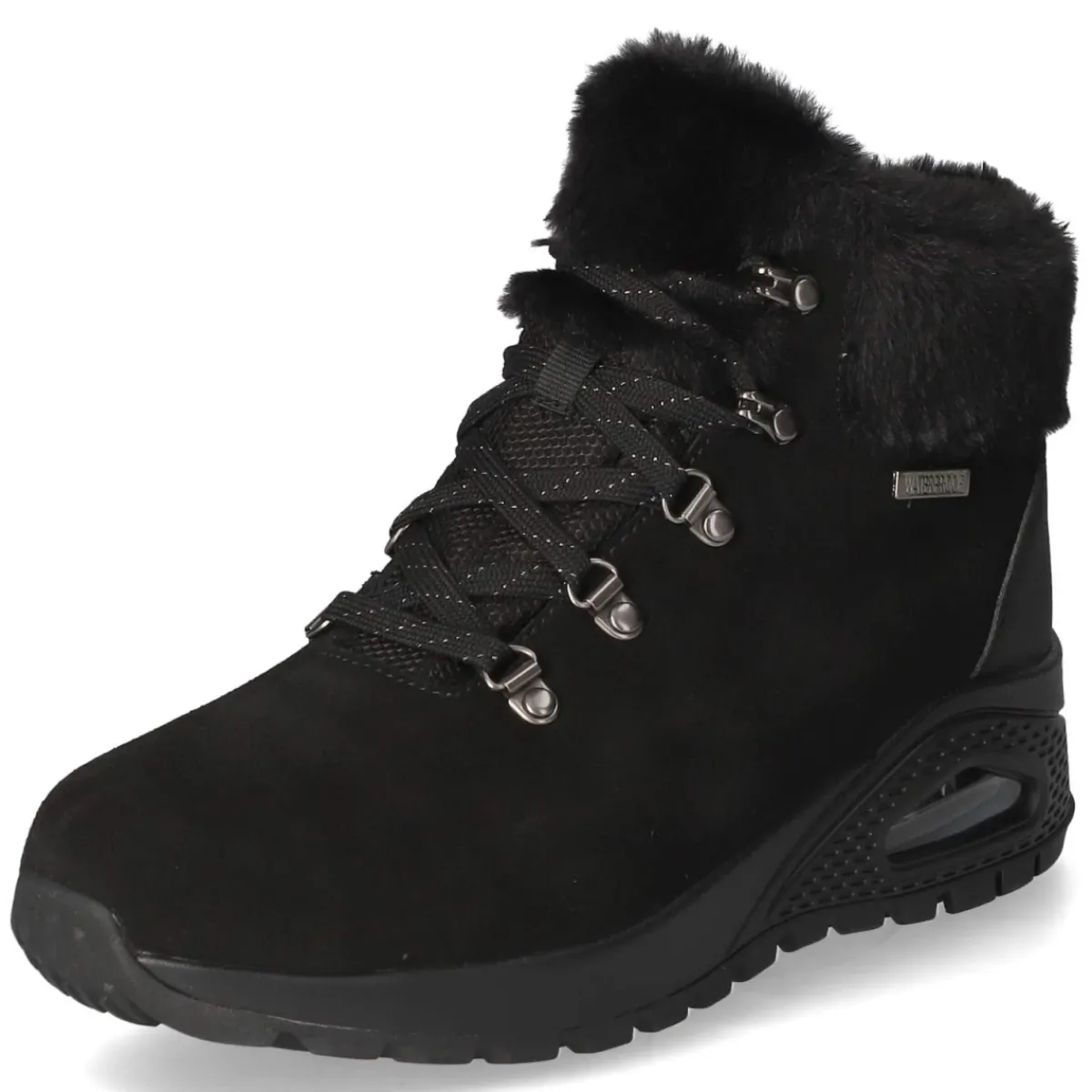 Der Winter Boots MOONLIGHT RIDGE von Skechers verbindet urbane Optik mit funktionaler Stärke. Schwarzes Rauleder und präzise Ziernähte treffen auf ein wasserfestes Obermaterial, das Feuchtigkeit zuverlässig abwehrt. Das warme Textilfutter umschließt den Fuß wohlig, während die atmungsaktive Ausstattung für ausgeglichenes Klima sorgt. Die runde Spitze und der verstärkte Fersenbereich sichern Komfort und Stabilität, die rutschhemmende Laufsohle bietet Halt auf glatten Wegen. Die Schnürung erlaubt individuelle Anpassung, die Decksohle aus Textil und die gepolsterte Memory-Foam-Fußbettung sorgen für weiche Auftritte. Der Schaftrand in Kunstfelloptik und der Markenschriftzug runden den Look ab. Das Modell fällt normal aus und ist damit unkompliziert in der Größenwahl. Modetipp: Zu dunkler Denim, Oversize-Strick und einem langen Wollmantel entfaltet das schwarze Design seine elegante Winterwirkung.