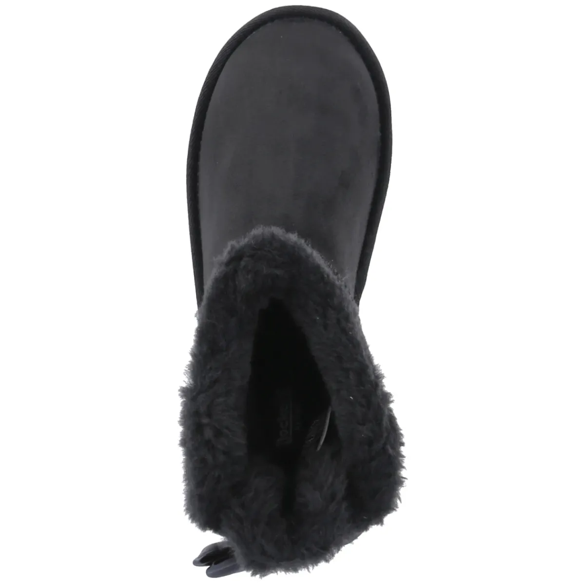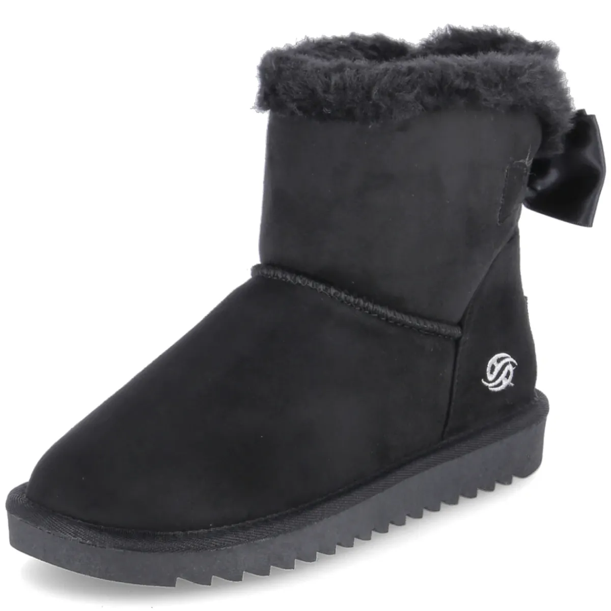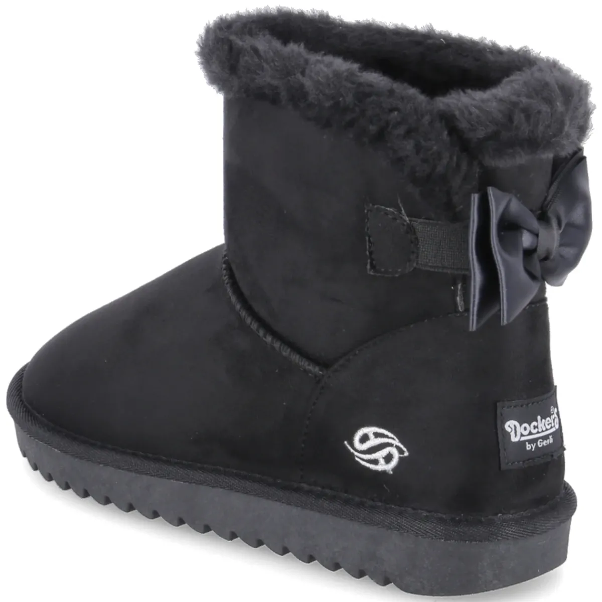 Winterboots von Dockers für Kinder setzen auf kuscheligen Komfort und verlässliche Alltagstauglichkeit. Das samtige, robuste Textilobermaterial in klassischem Schwarz umschließt den Fuß mit einer runden Spitze, während der verschlusslose Schlupfeinstieg das Anziehen spielend leicht macht. Am Schaft sorgt ein weicher Kunstfellkragen mit hübschem Schleifendetail für winterliche Optik. Innen wärmt dichtes Kunstfellfutter, ergänzt von einer weichen, textilen Decksohle. Eine verstärkte Ferse erhöht die Stabilität, die rutschhemmende Profilsohle bietet sicheren Halt auf glatten Wegen. So entstehen kindgerechte Boots, die auf dem Spielplatz ebenso überzeugen wie auf dem Schulweg. Modetipp: Zu Thermoleggings, Strickkleid und Parka kombinieren – schwarze Boots bringen ruhige Eleganz in farbige Winteroutfits.