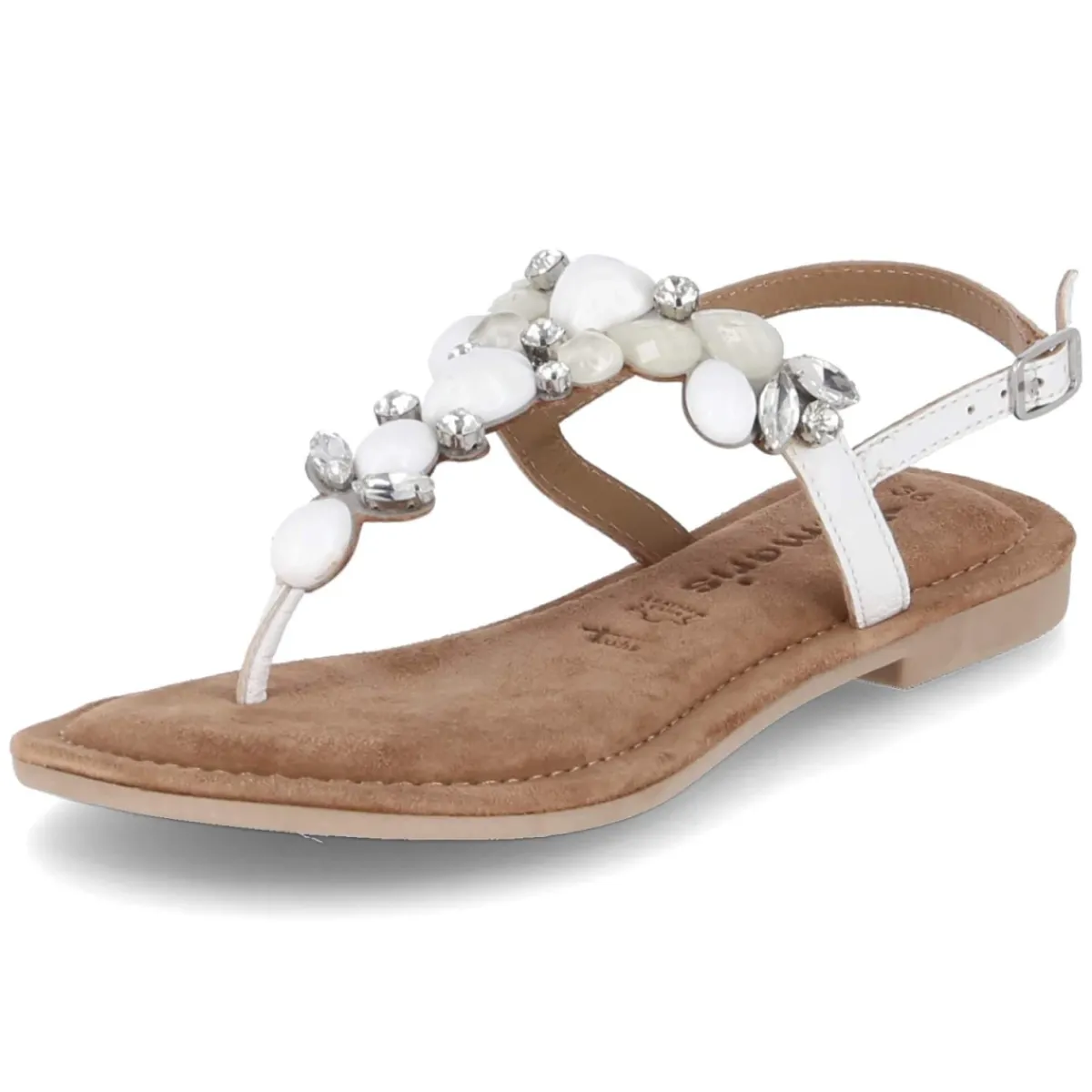 Dieser weiße Zehentrenner von Tamaris verbindet feminine Eleganz mit sommerlicher Leichtigkeit. Das Obermaterial aus Leder und Textil schmiegt sich angenehm an den Fuß, während die offene Schuhspitze und die lederne Decksohle für ein luftiges Tragegefühl sorgen. Für Komfort steht das weich gepolsterte Fußbett, das auch bei längeren Anlässen überzeugt. Die fein funkelnden Schmucksteine verleihen dem festlichen Design einen edlen Akzent, ideal für besondere Sommermomente. Dank Schnalle mit Elastikeinsatz sitzt der Riemen sicher, ohne einzuengen, und die flexible, rutschfeste Laufsohle gibt zuverlässigen Halt. In der Größe fällt das Modell normal aus und bietet so eine unkomplizierte Passform für Damen. Modetipp: Zu fließenden Midikleidern in Pastelltönen oder einer weißen Leinenhose mit Satin-Top kommt der strahlende Look besonders harmonisch zur Geltung.