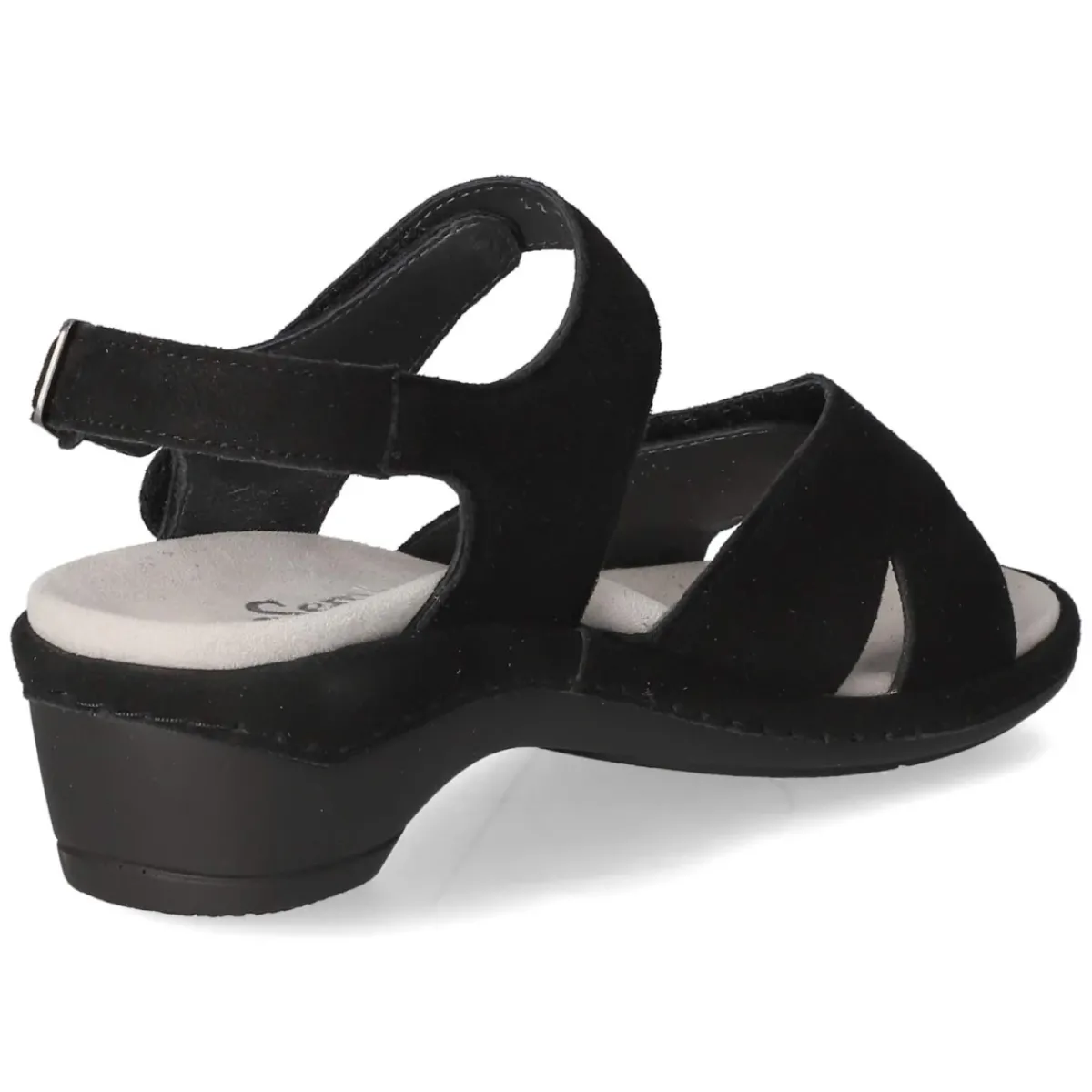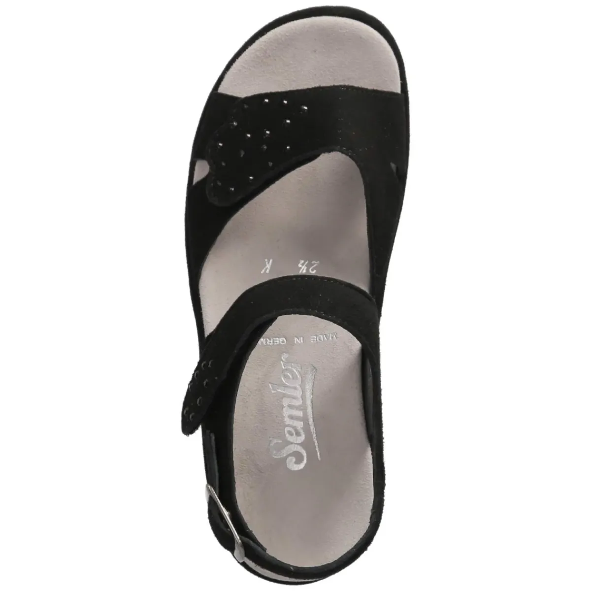 Diese Damen-Sandale von Semler verbindet edles Design mit wohltuendem Komfort. Weiches Rauleder in zeitlosem Schwarz umschmeichelt den Fuß, während atmungsaktives Echtleder innen für ein angenehm temperiertes Klima sorgt. Zwei Klettverschlüsse erlauben eine individuelle Anpassung, ergänzt von Schnalle und Druckknopf als praktische und dekorative Akzente. Schimmernde Schmucksteine setzen einen dezenten Glanz, die offene Spitze verleiht sommerliche Leichtigkeit. Ein vorgeformtes, gepolstertes Lederfußbett lässt sich bei Bedarf wechseln und unterstützt müheloses Gehen. Der 3,5 cm hohe Blockabsatz bietet sicheren Stand, die flexible, rutschhemmende Laufsohle verbessert die Traktion auf unterschiedlichen Untergründen. Das Modell fällt normal aus und eignet sich ideal für Erwachsene, die Wert auf Qualität legen. Modetipp: Besonders elegant wirkt die Sandale zu fließenden Midikleidern oder verkürzten Leinenhosen in Naturtönen.