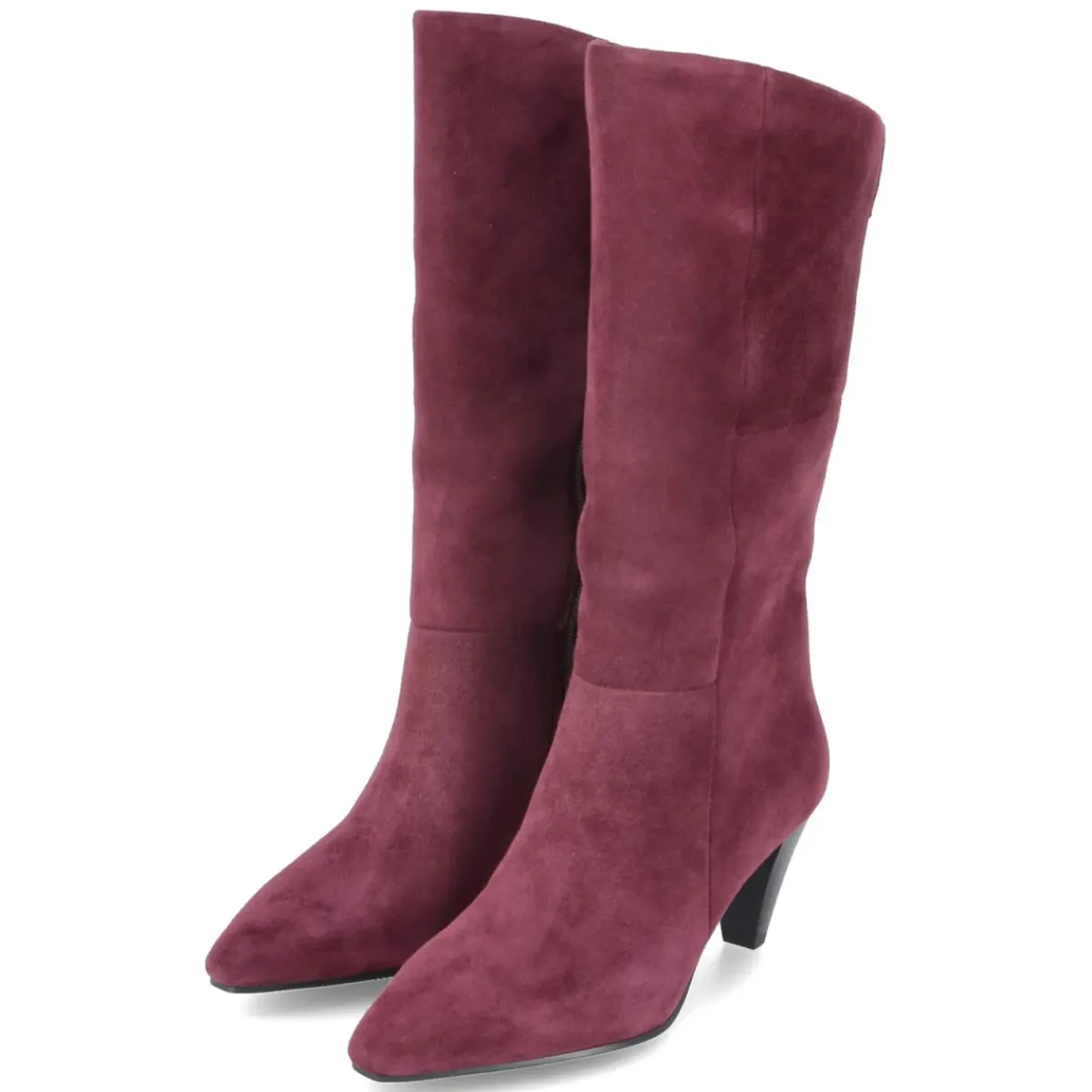 Ein Statement in Weinrot: Der Damen-Stiefel von Tamaris verbindet eine samtige Rauleder-Oberfläche mit spitzer Schuhspitze und einem kontrastierenden, schwarzen Trichterabsatz von 7 cm. Der Schaft misst ca. 37 cm in der Höhe und ca. 34 cm im Umfang, ergänzt durch einen kleinen Elastikeinsatz für angenehme Nachgiebigkeit. Ein praktischer Reißverschluss erleichtert den Einstieg, das gepolsterte Fußbett und die flexible Laufsohle sorgen für Komfort im Alltag. Innen verwöhnt eine textile Decksohle. Die schlanke Silhouette streckt optisch das Bein und bleibt dank normaler Passform alltagstauglich. Modetipp: Besonders edel wirkt das Modell zu einem cremefarbenen Midikleid und einem strukturierten Wollmantel, dazu eine farblich abgestimmte Tasche für einen ruhigen, eleganten Look.
