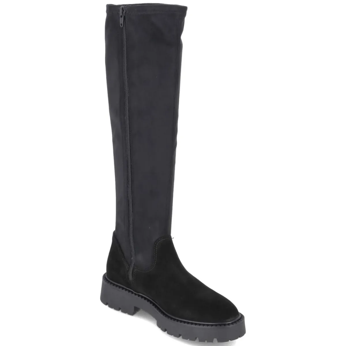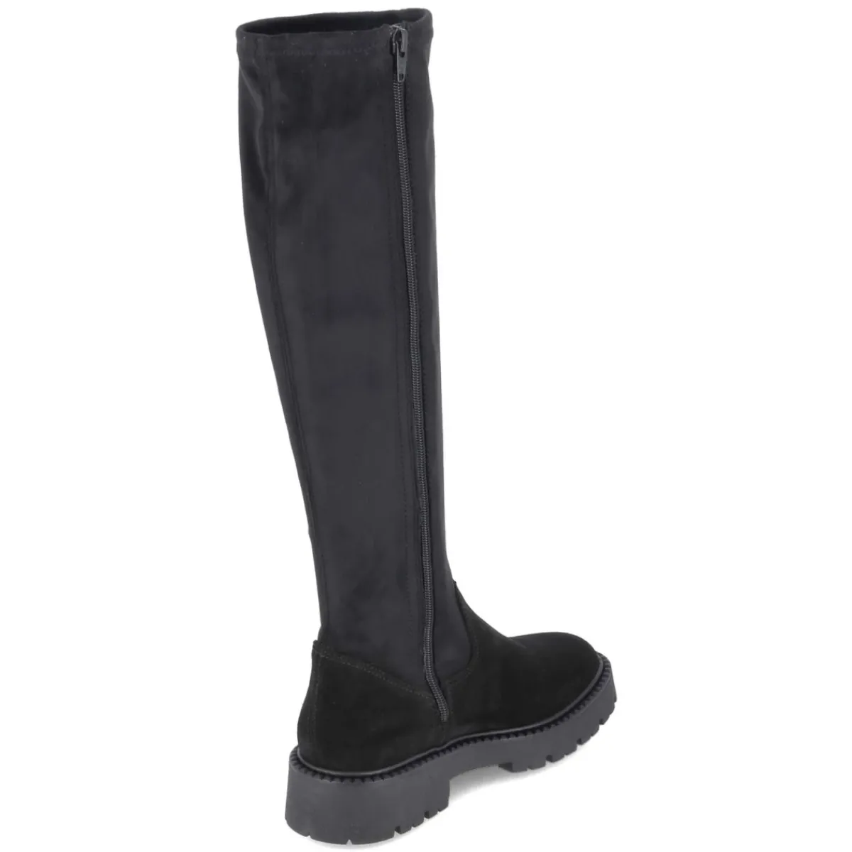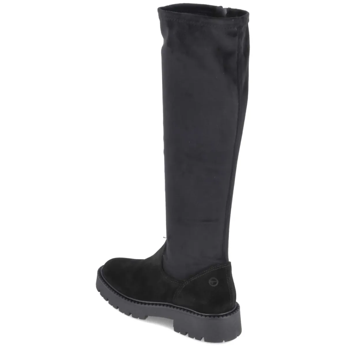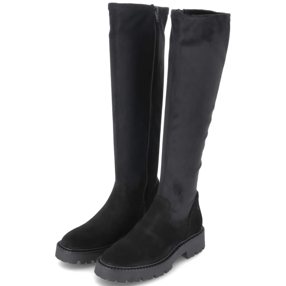 Der schwarze Stiefel von Tamaris verbindet zeitlosen Chic mit hohem Tragekomfort. Die samtige Oberfläche und das Obermaterial aus Leder und Textil sorgen für eine edle Anmutung, während der stretchige Schaft mit ca. 43 cm Höhe und ca. 32 cm Umfang eine schmeichelnde Passform bietet. Ein bequemer Reißverschluss erleichtert den Einstieg, das gepolsterte Fußbett und die Decksohle aus Textil & Synthetik begleiten entspannt durch den Tag. Der 4 cm hohe Blockabsatz und die rutschhemmende Profilsohle gewährleisten Stabilität, die runde Spitze setzt einen femininen Abschluss. Der Stiefel fällt größengetreu aus und eignet sich für vielfältige Anlässe von Office bis Freizeit. Modetipp: Mit Midikleid in Strick und langem Mantel entsteht ein harmonischer Look, der die schlanke Silhouette des Schafts elegant betont.