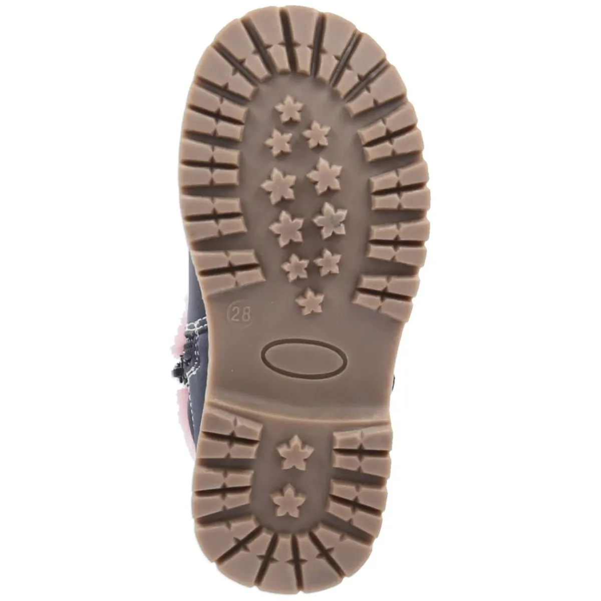 Der Kinderstiefel von Indigo in Dunkelblau verbindet Funktion und verspielte Details. Das Obermaterial aus Textil und Synthetik trotzt nassem Wetter, zugleich bleibt der Schuh atmungsaktiv – ideal für kühle Tage mit leichtem Futter. Der runde Leisten bietet Zehenfreiheit, das gepolsterte Fußbett erhöht den Tragekomfort im Alltag. Ein seitlicher Reißverschluss erleichtert das An- und Ausziehen, während der stabile 2,5‑cm‑Blockabsatz sicheren Stand gibt. Herzpatch in Rosa, eine passende Fellkrempe am Einstieg und ein zierender Knöchelriemen mit Herzschnalle setzen charmante Akzente. Die flexible, rutschhemmende Profilsohle sorgt für Halt auf verschiedenen Untergründen. Fällt normal aus und eignet sich für Kita, Spielplatz und Schulweg. Modetipp: Zu Jeans, Ringelshirt und Parka kombinieren, dazu farblich abgestimmte Mütze in Rosa für einen harmonischen Look.