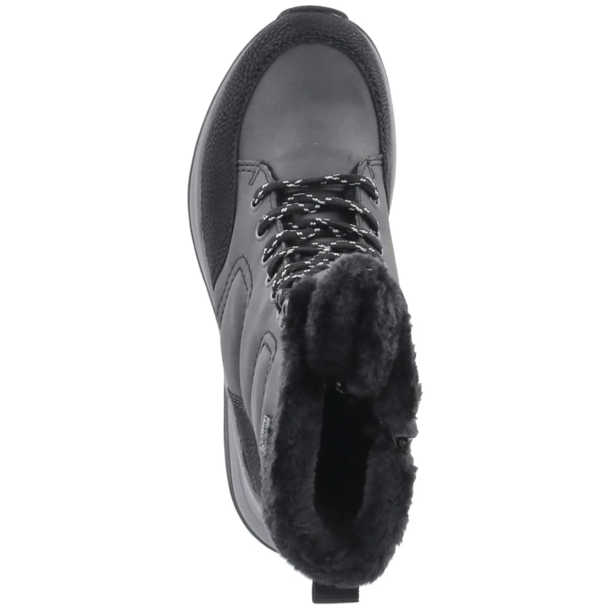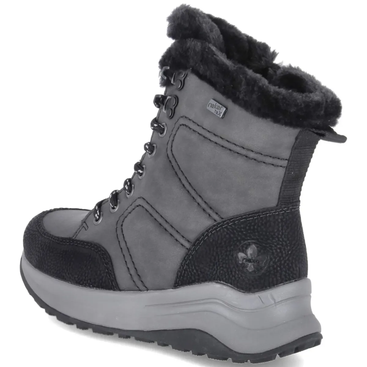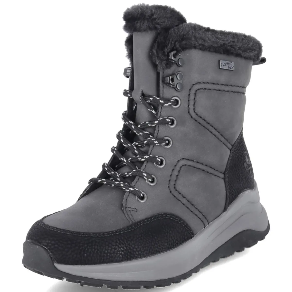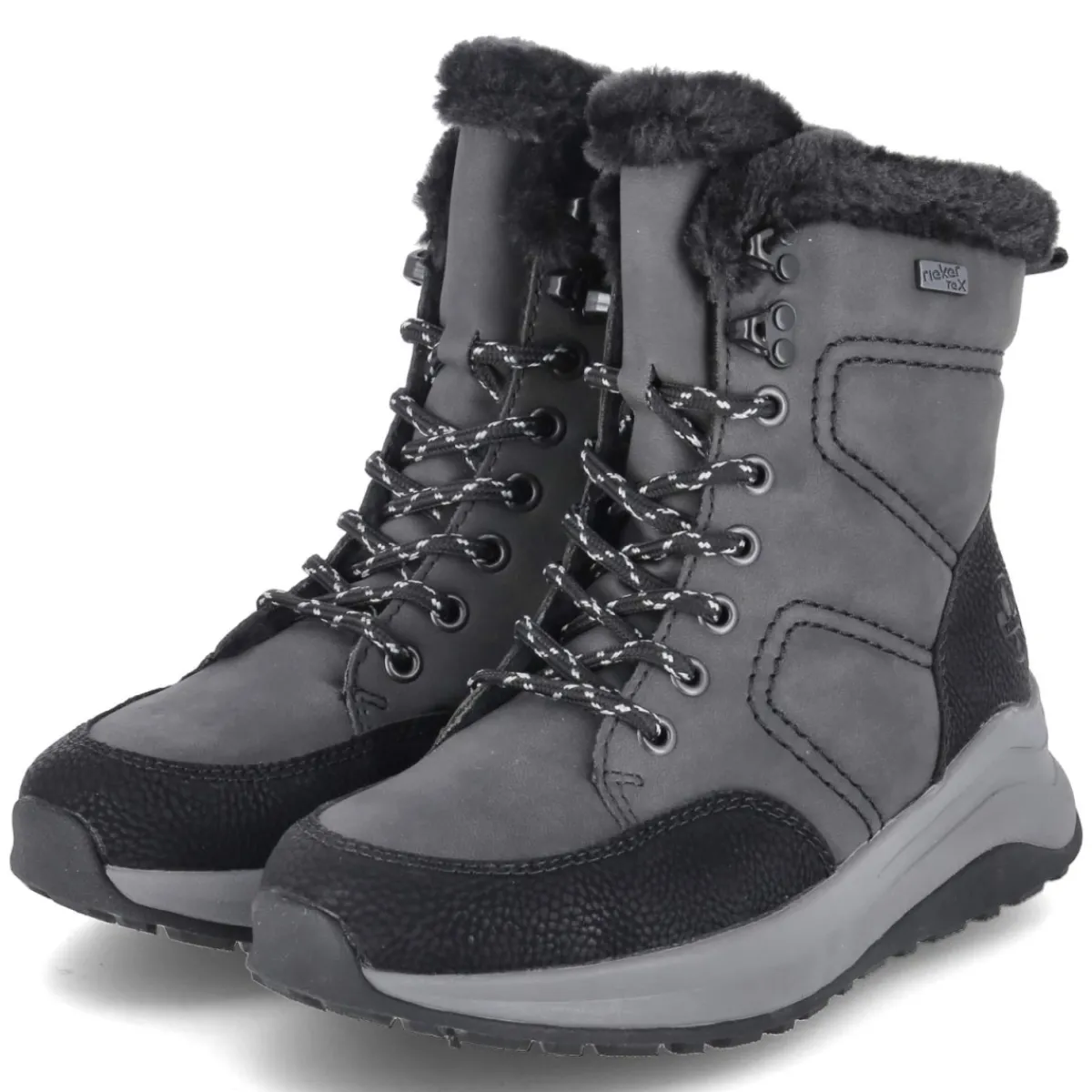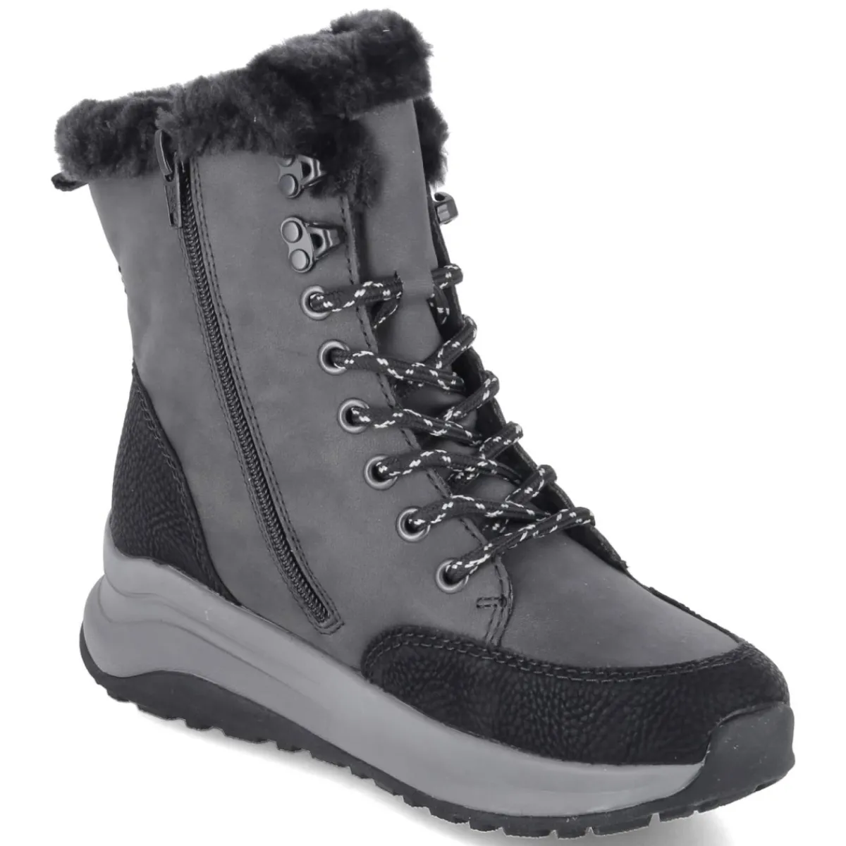 Der Winterboot von Rieker setzt auf funktionalen Komfort und sportliche Lässigkeit. Das wasserfeste Obermaterial aus pflegeleichtem Kunstleder schützt zuverlässig vor Nässe, während das Warmfutter wohltuende Isolation bietet. Die Kombination aus Schnürung und zusätzlichem Reißverschluss erleichtert den Einstieg, unterstützt von Anziehlasche und weichem Schaft mit Kunstfellkrempe. Ein komfortables Wechselfußbett mit textiler Decksohle sorgt für angenehme Dämpfung, die flexible, rutschfeste Profilsohle liefert Grip auf winterlichen Wegen. Runde Schuhspitze sowie verstärkter Fersen- und Zehenbereich erhöhen den Tragekomfort und die Robustheit. Das graue Design fügt sich mühelos in Alltagslooks ein. Das Modell fällt schmal aus; eine Nummer größer empfiehlt sich. Modetipp: Mit Wollsocken, Strickrock und Oversize-Steppjacke entsteht ein stimmiger City-Winterlook.