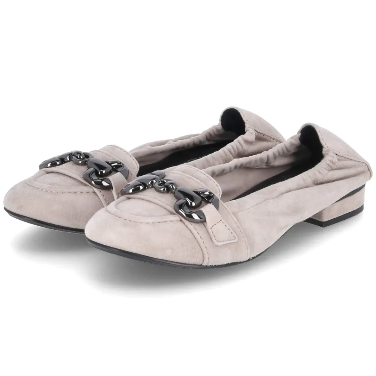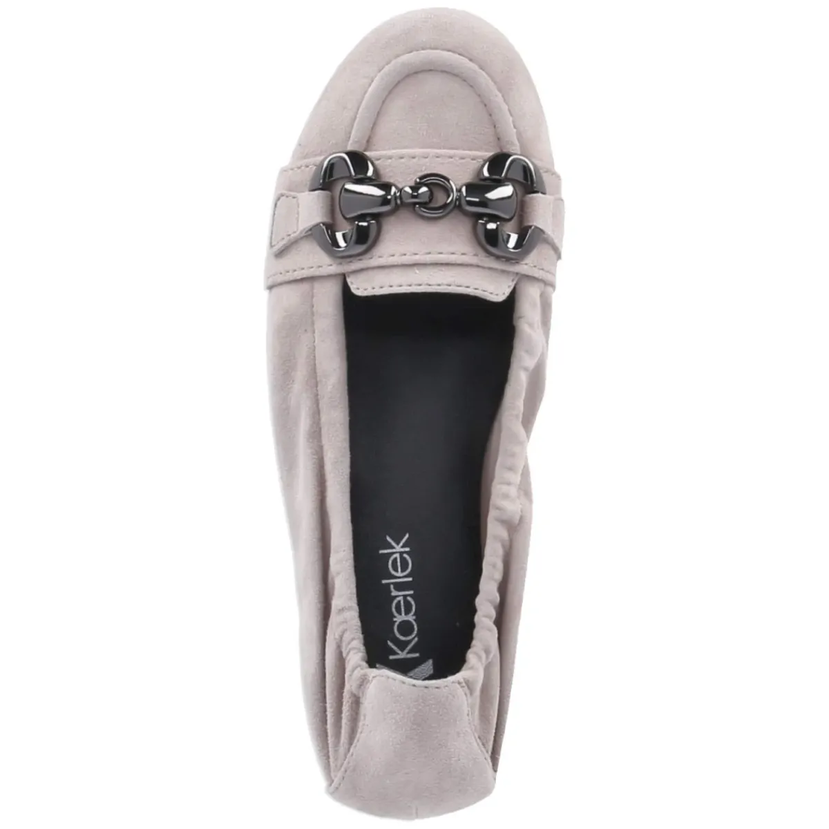 Die Ballerinas von Kaerlek verbinden subtile Raffinesse mit hohem Tragekomfort. Weiches Rauleder in sanftem Beige und eine runde Spitze sorgen für eine edle, zeitlose Anmutung. Das langlebige Echtleder wird von einer gepolsterten Lederdecksohle ergänzt, die zusammen mit dem elastischen Einstieg und der verstärkten Ferse sicheren Halt bietet. Ein 2 cm hoher Blockabsatz und die sehr flexible, rutschhemmende Laufsohle machen das Modell alltagstauglich – vom Office bis zum Dinner. Charakteristisches Detail ist die kleine Zunge mit Zierriemen und Metallelement in glänzender Titanoptik, die den Stil modern abrundet. Ohne Verschluss, fällt normal aus und schmiegt sich angenehm an den Fuß. Modetipp: zu verkürzten Zigarettenhosen und einem feinen Stricktop kombinieren; ein Trenchcoat in Sandtönen komplettiert den eleganten Look.