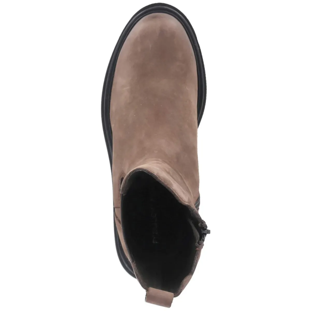 Der Chelsea Boot von Fräulein Frida verbindet zeitlose Form mit funktionalen Details. Weiches Rauleder in sattem Braun und langlebiges Echtleder sorgen für eine hochwertige Anmutung, während die Lederdecksohle und das gepolsterte Fußbett den Komfort im Alltag erhöhen. Der unkomplizierte Einstieg gelingt dank großem seitlichem Elastikeinsatz und Anziehlasche, die rutschfeste Laufsohle bietet Halt auf städtischem Terrain. Ein 4 cm hoher Blockabsatz stabilisiert und streckt dezent, die runde Spitze wirkt klassisch und feminin. Der verstärkte Fersenbereich erhöht die Formstabilität, die Passform fällt normal aus. Für Damen designt und ohne Verschluss besonders praktisch. Modetipp: Zum Midikleid aus Strick und einer wolligen Oversize-Jacke kombiniert entsteht ein moderner Kontrast aus feinem Material und robustem Boot.