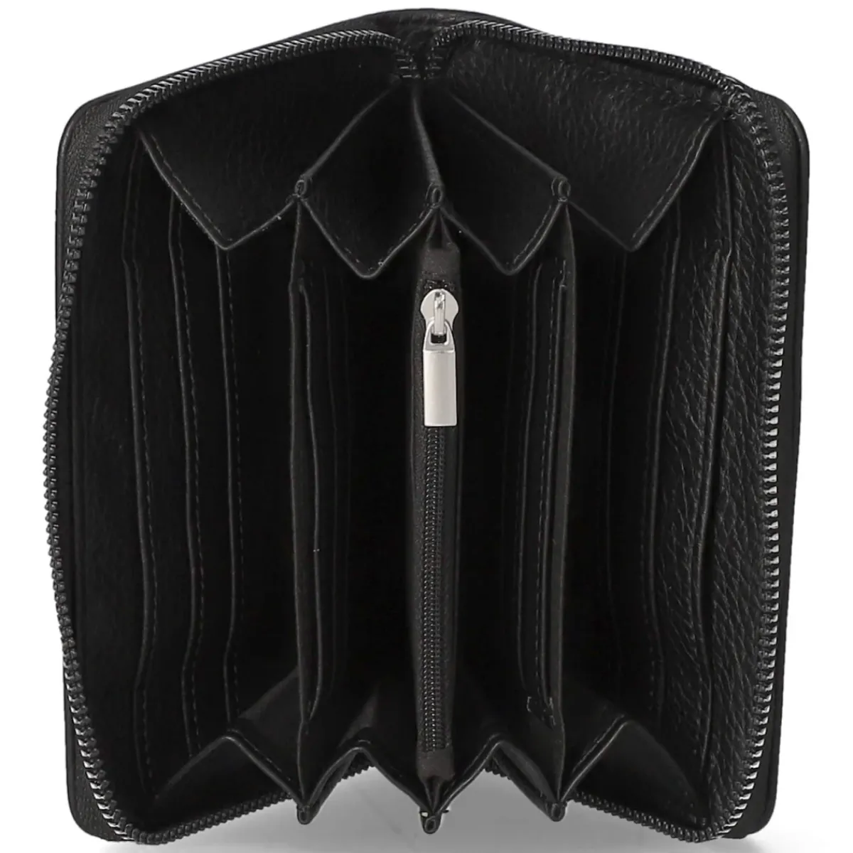 Dieses klassische Damen-Portemonnaie in Schwarz verbindet klare Linien mit durchdachter Funktion. Das Reißverschluss-Hauptfach schützt Inhalte zuverlässig, während das silberfarbene Markenlogo einen dezenten Akzent setzt. Im Inneren sorgt die strukturierte Aufteilung für Übersicht: 6 Visitenkartenfächer, 6 Steckfächer, ein Reißverschlussmünzfach und vier Geldscheinfächer nehmen Karten, Belege, Münzen und Scheine sauber auf. Mit den handlichen Maßen von ca. 10,5 x 16 x 3 cm liegt das Modell angenehm in der Hand und passt in viele Taschen, ohne aufzutragen. Der Look bleibt zeitlos und fügt sich von Business bis Freizeit nahtlos ein. Modetipp: In Kombination mit einer schwarzen Satchel und Schmuck in Silber harmoniert das Wallet optimal; ein monochromes Outfit lässt das Logo elegant wirken.