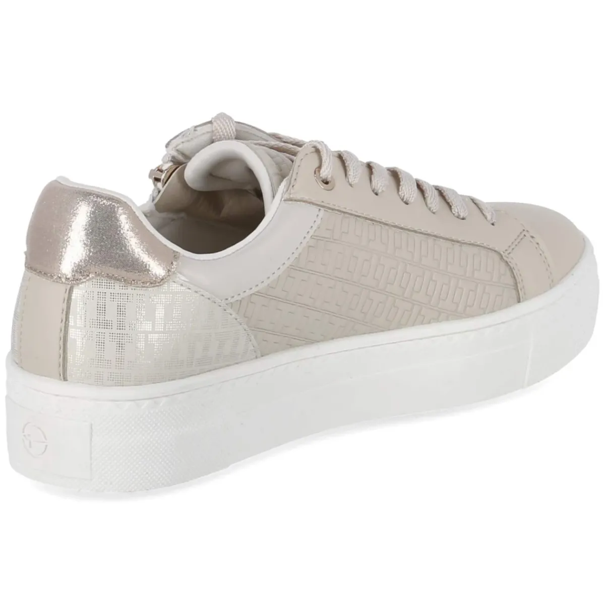 Dieser Low Sneaker von Tamaris verbindet eine moderne Optik mit smarten Details. Das gemusterte Obermaterial aus Textil und Synthetik in elegantem Beige wirkt frisch und vielseitig, die runde Spitze und das 3,5 cm hohe Plateau sorgen für einen zeitgemäßen Look mit leichtem Lift. Praktisch wird es dank Schnürsenkeln und zusätzlichem Reißverschluss, der das An- und Ausziehen erleichtert. Das komfortable Wechselfußbett mit textiler Decksohle bietet angenehme Dämpfung und lässt sich bei Bedarf einfach austauschen. Aus veganen Materialien gefertigt, fällt das Modell normal aus und eignet sich als zuverlässiger Begleiter im Alltag. Modetipp: Zu locker geschnittenen Anzughosen und einem feinen Stricktop entsteht ein lässig-elegantes City-Outfit, das das Muster dezent in Szene setzt.