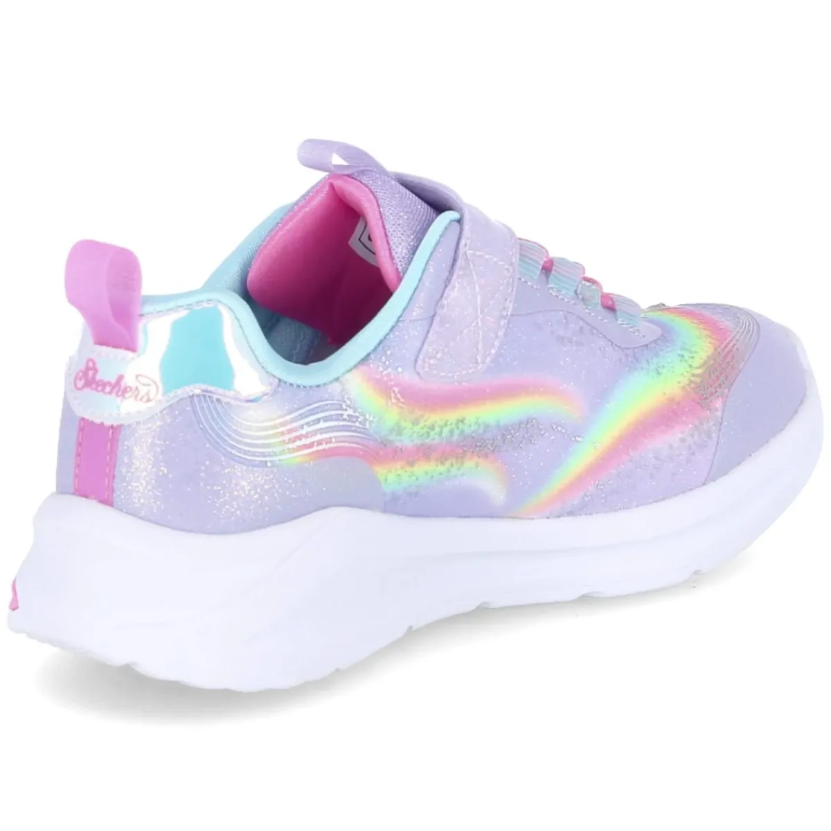 Der Skechers Low Sneaker UNICORN CHASER bringt mit lila Glanz und fantasievollen Details magische Energie in den Alltag. Das glitzernde Obermaterial aus Textil zeigt einen Regenbogenprint und ein seitliches Einhorn, dazu blitzen schaltbare LEDs in der Sohle bei jedem Schritt. Der bequeme Klettverschluss erleichtert das An- und Ausziehen, während gepolsterter Einstieg und weich gepolstertes Fußbett für Komfort sorgen. Die runde Spitze, der moderne Material-Mix sowie verstärkte Zehen- und Fersenbereiche bieten kindgerechten Halt. Eine flexible, rutschhemmende non-marking Laufsohle macht den Schuh hallentauglich. Die Passform fällt normal aus und das gelabelte Design überzeugt auf dem Schulhof ebenso wie beim Spielen. Modetipp: Zu Jeans in Pastelltönen, kuscheligem Hoodie und glitzernden Socken kombinieren – ein Rucksack mit Regenbogendetails rundet den Look ab.