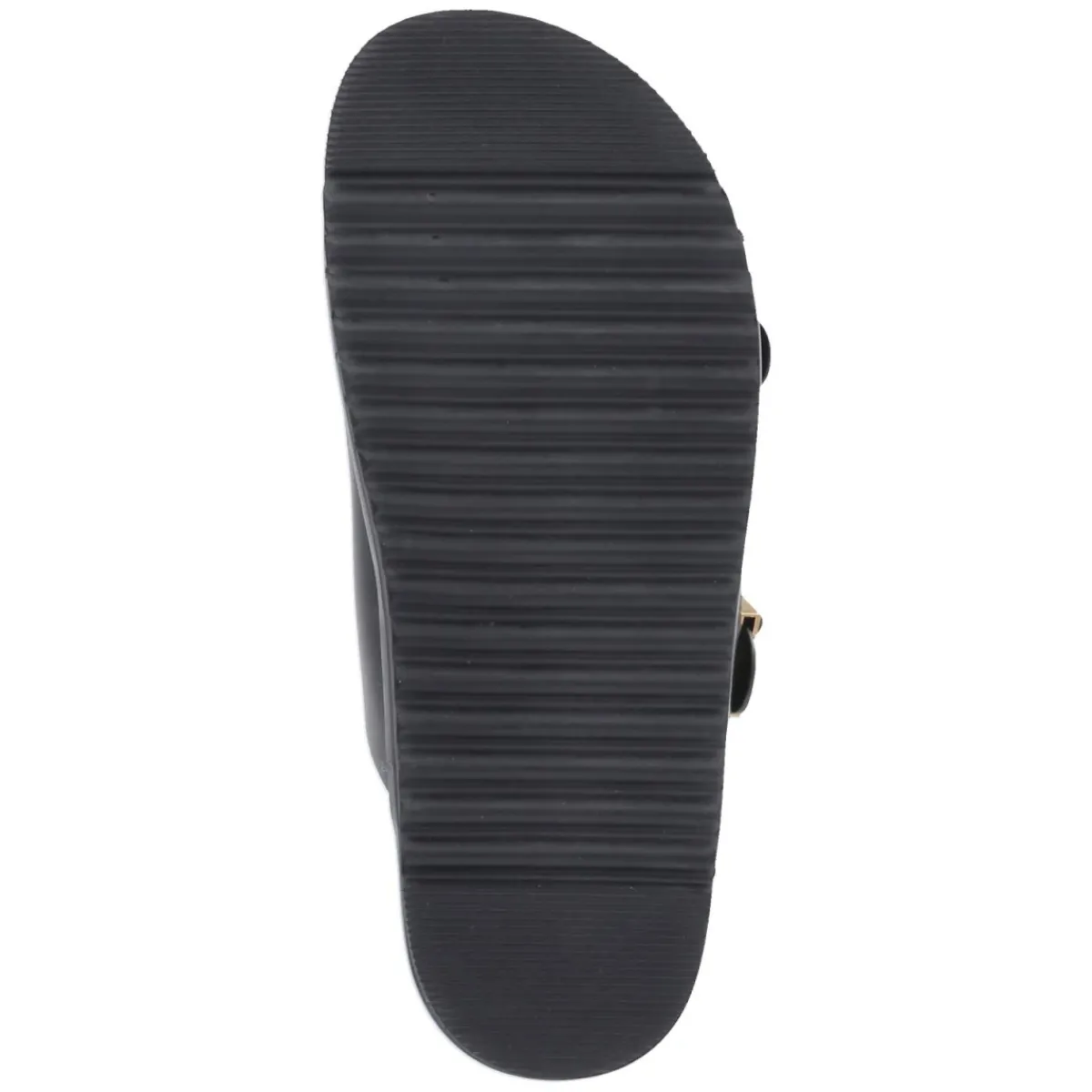 Die Pantoletten RACHEL PENNY von Mexx präsentieren eine zeitgemäß reduzierte Silhouette, die mit zwei kupferfarbenen Schnallen einen eleganten Akzent setzt. Das schwarze Obermaterial aus Synthetik zeigt eine angenehm pflegeleichte Oberfläche, während die offene Schuhspitze luftigen Tragekomfort vermittelt. Ein vorgeformtes, dämpfendes Tieffußbett unterstützt den Fuß spürbar und begleitet souverän durch Alltag, City und Urlaub. Die flexible, griffige Laufsohle gibt Halt auf verschiedensten Untergründen, das seitliche Label verleiht dezente Markenpräsenz. Dank verstellbarer Schnallen lässt sich der Sitz optimal anpassen; die Passform fällt normal aus und erleichtert die Größenauswahl. Die Kombination aus schlichter, moderner Optik und guten Kombinationsmöglichkeiten macht dieses Modell zum verlässlichen Begleiter für vielseitige Looks. Modetipp: Zu fließender Culotte und ärmellosem Stricktop kombinieren, dazu eine strukturierte Umhängetasche in Cognac für ein harmonisches Finish.