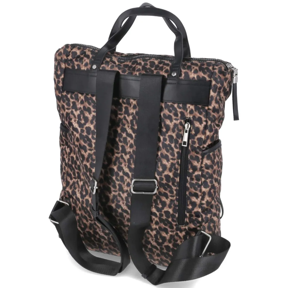 Mit ausdrucksstarkem Animal Print in warmem Braun setzt dieser Rucksack ein modisches Statement und bleibt zugleich alltagstauglich. Das Format von ca. 40 x 33 x 10 cm und ein Volumen von etwa 13 Litern bieten genügend Platz für Essentials. Ein Reißverschlusshauptfach schützt den Inhalt, während außen ein Rückenfach, zwei Seitentaschen und eine aufgesetzte Fronttasche schnelle Ordnung schaffen. Innen sorgen ein Steckfach, ein RV-Fach sowie ein gepolstertes Frontfach in Laptopgröße für Struktur. Zwei Henkel und verstellbare Tragegurte ermöglichen flexible Trageoptionen, der verstärkte Boden gibt Stabilität. Ideal für City, Büro oder Kurztrip. Modetipp: Der markante Print wirkt besonders edel zu monochromen Looks in Schwarz, Creme oder Camel; feine Gold-Details und weiße Sneaker runden den Auftritt modern ab.