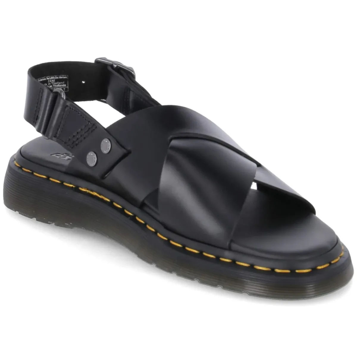 ZANE von Dr. Martens interpretiert die Herren-Sandale als markantes Statement. Schwarzes Glattleder mit breiten, gekreuzten Riemen trifft auf eine robuste Fersenpartie mit verstellbarer Schnalle. Die offene Schuhspitze sorgt für Luftigkeit, das gepolsterte Fußbett mit Lederdecksohle schenkt angenehmen Komfort auch an längeren Tagen. Typisch Dr. Martens akzentuiert die gelbe Naht die rutschhemmende Profilsohle und verleiht dem Design einen unverwechselbaren Rahmen. Dank der klaren Formensprache entstehen vielfältige Kombinationsmöglichkeiten von City bis Strandpromenade. Hinweis zur Passform: fällt schmaler aus. Modetipp: Zu verkürzten, geraden Jeans und einem schlichten weißen Hemd stylen, dazu schwarze Ledergürtel-Details aufgreifen – so kommt die gelbe Naht als subtiler Farbakzent optimal zur Geltung.