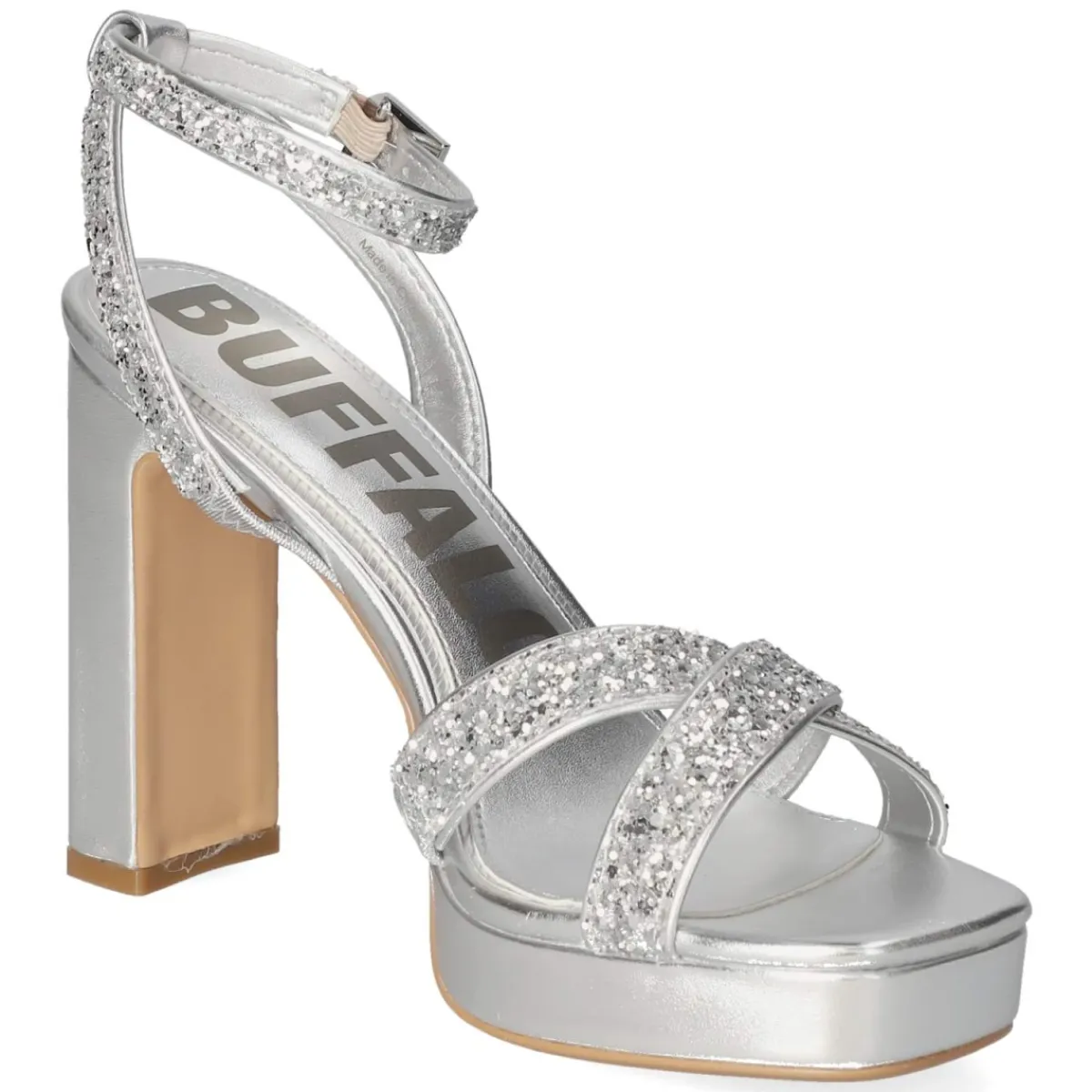 Die Sandaletten JUNE GLAM von Buffalo setzen mit silbernem Metallic-Finish und edlem Glitzer funkelnde Akzente. Elegant gekreuzte Riemchen umspielen den Fuß, während der verstellbare Schnallenverschluss sicheren Halt bietet. Der 11,5 cm hohe Blockabsatz streckt die Silhouette und bleibt dank der robusten Laufsohle angenehm tragbar. Eine leicht gepolsterte Decksohle aus Synthetik erhöht den Komfort, die offene Spitze wirkt sommerlich-leicht. Das Obermaterial aus Textil und Synthetik wird aus veganen Materialien gefertigt und überzeugt mit glamourösem Look und vielseitigen Kombinationsmöglichkeiten. Das Modell fällt etwas weiter aus und schenkt damit Luftigkeit bei warmen Anlässen. Modetipp: Zum Satin-Slipdress in Schwarz oder zu weißen Wide-Leg-Hosen kombiniert, entsteht ein moderner Abend-Look; eine silberne Clutch greift den Glanz stimmig auf.