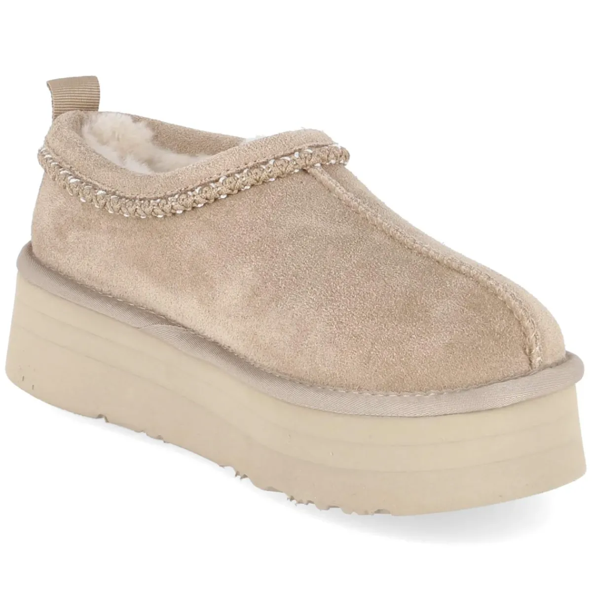 Der Slipper OUTBACK von Australia Luxe vereint lässige Gemütlichkeit mit markantem Auftritt. Robustes Rauleder aus echtem Leder in warmem Beige trifft auf eine 4,5 cm hohe Plateau-Sohle, die dezent streckt und angenehm dämpft. Das weiche Lammfellfutter sorgt für wohlige Wärme, während die textile Decksohle Komfort bietet. Der tiefe Einstieg mit grober Ziernaht unterstreicht das native Design, die Anziehlasche mit Markenstickerei erleichtert das Hineinschlüpfen – ganz ohne Verschluss. Mit runder Spitze und normaler Passform eignet sich der Slipper für den Alltag ebenso wie für urbane Winterlooks. Die stabile Verarbeitung verleiht Halt, das minimalistische Profil bleibt vielseitig kombinierbar. Modetipp: Besonders harmonisch zu weiten Strickhosen und einem voluminösen Mantel in Naturtönen oder als Kontrast zu Lederleggings und einem flauschigen Oversize-Pullover.